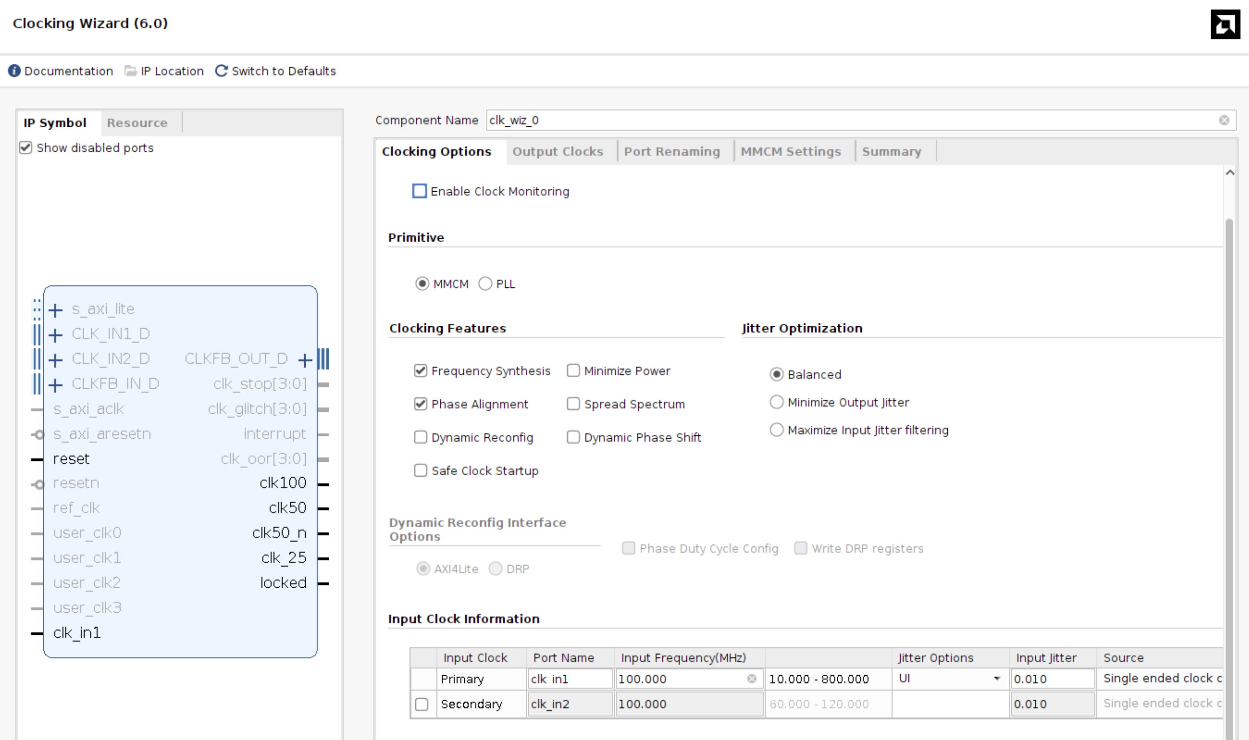 The Clocking Wizard window will appear. At the Clocking Options tab, choose MMCM. The MMCM module will be expecting a 100MHz input signal, and is coming from the Single-ended clock capable pin, N14, from your Alchitry Au.