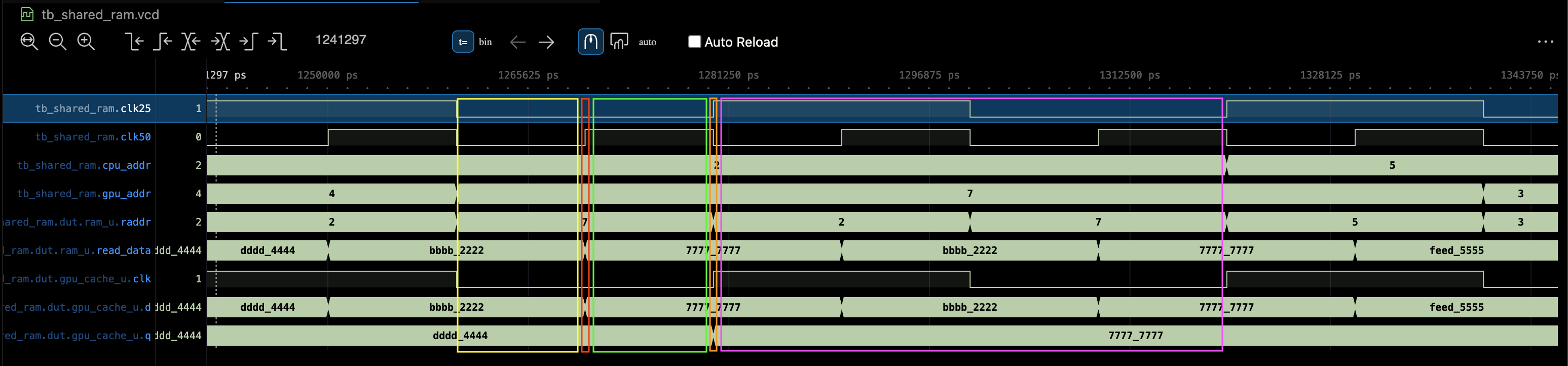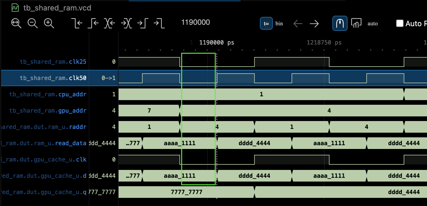 clk25period. Confirms the GPU sees the freshly written value exactly oneclk25period later. - Phase 4: CPU writes one address while the GPU reads a different address. Confirms there is no cross-address corruption.