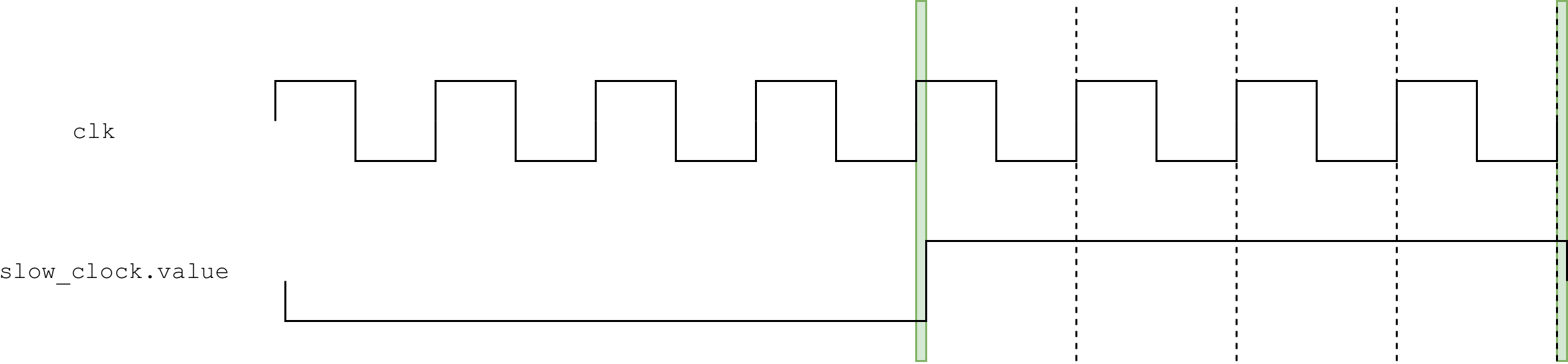 This means the output s does not update exactly at the slow clock edge but 10 ns after it. In most designs this is completely inconsequential since the slow clock period is orders of magnitude larger, for example 20 ms for a 50 Hz slow clock. But it is worth being aware of if you are building something that has tight dependencies between the slow clock edge and when downstream logic reads the output. For this lab, it does not affect the output you see or your design.