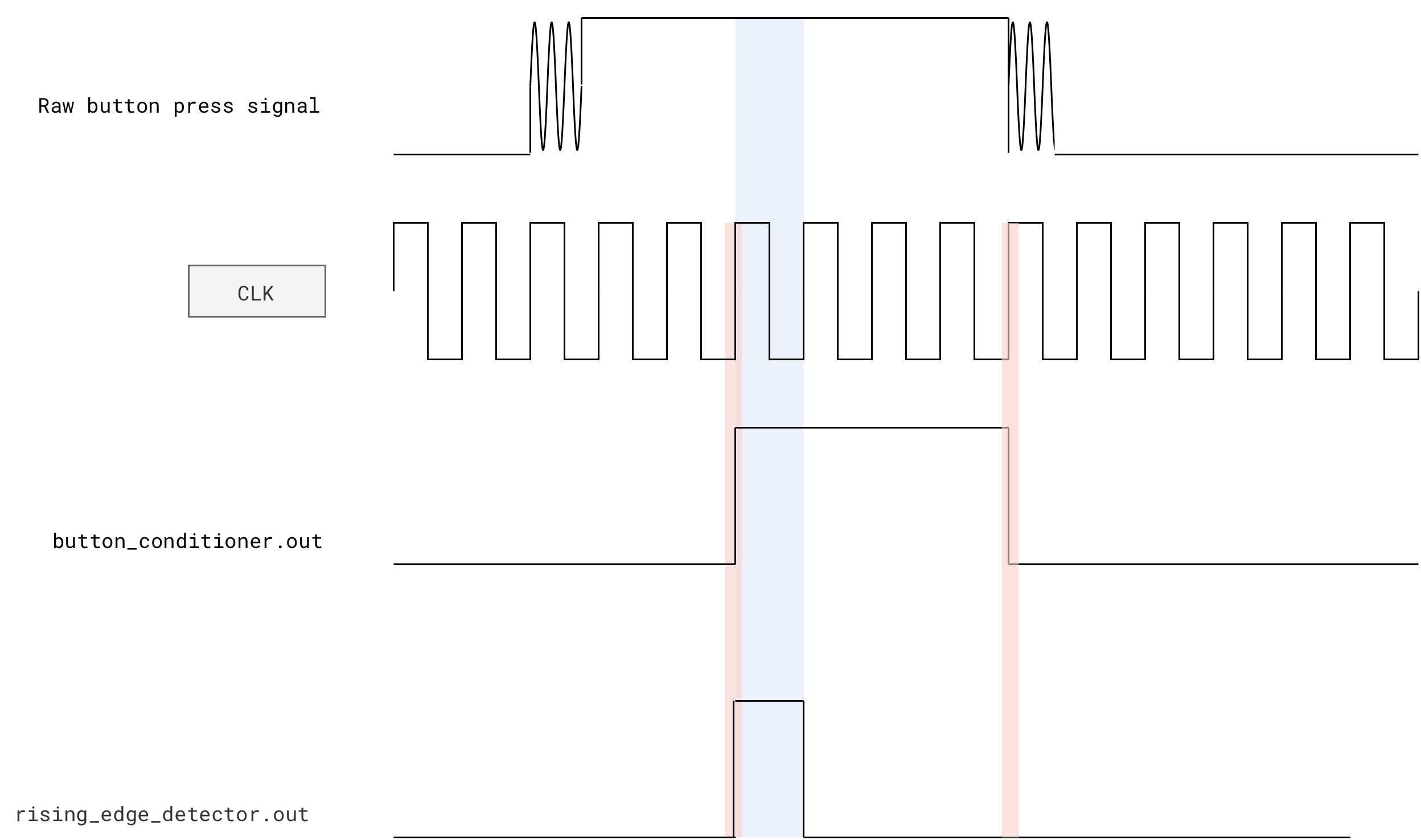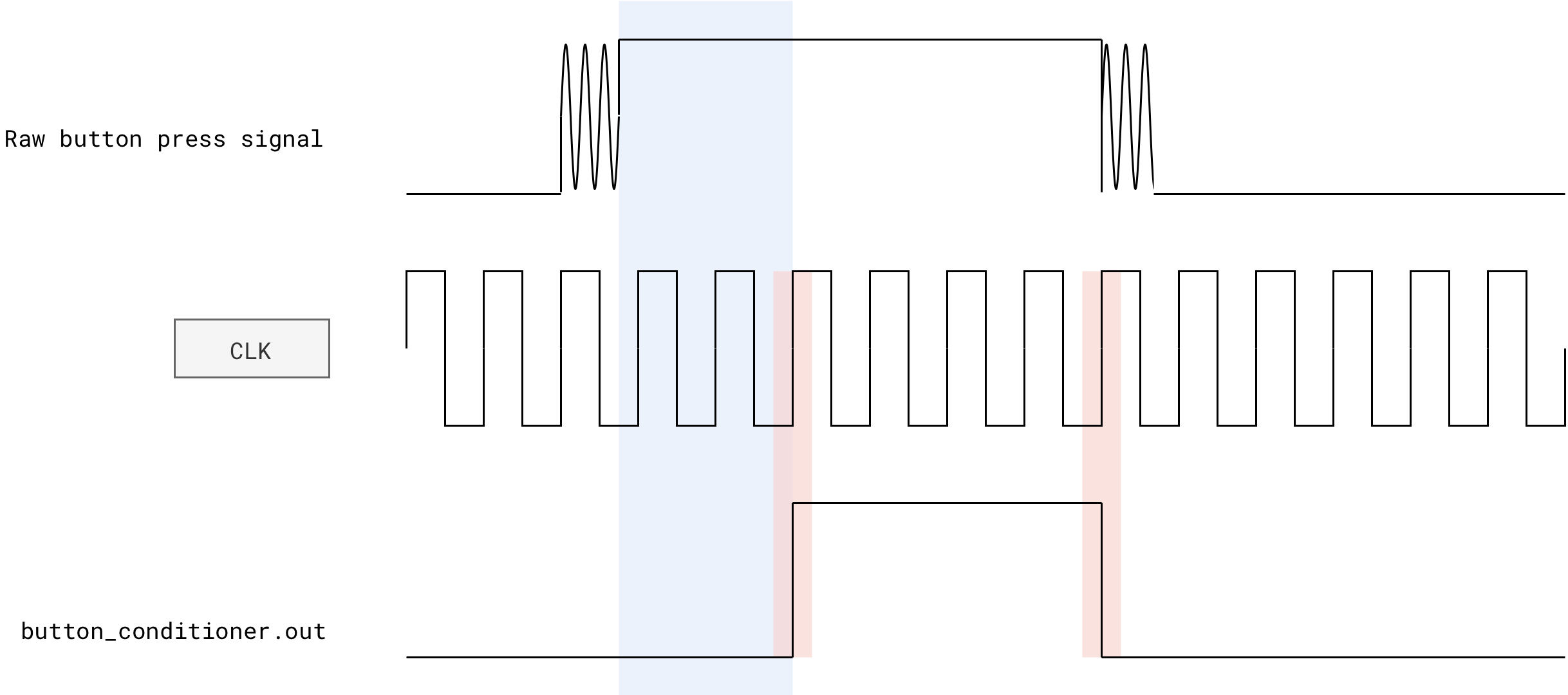 If button conditioner is used with an edge detector, button conditioner’s output is synchronized to the clock.