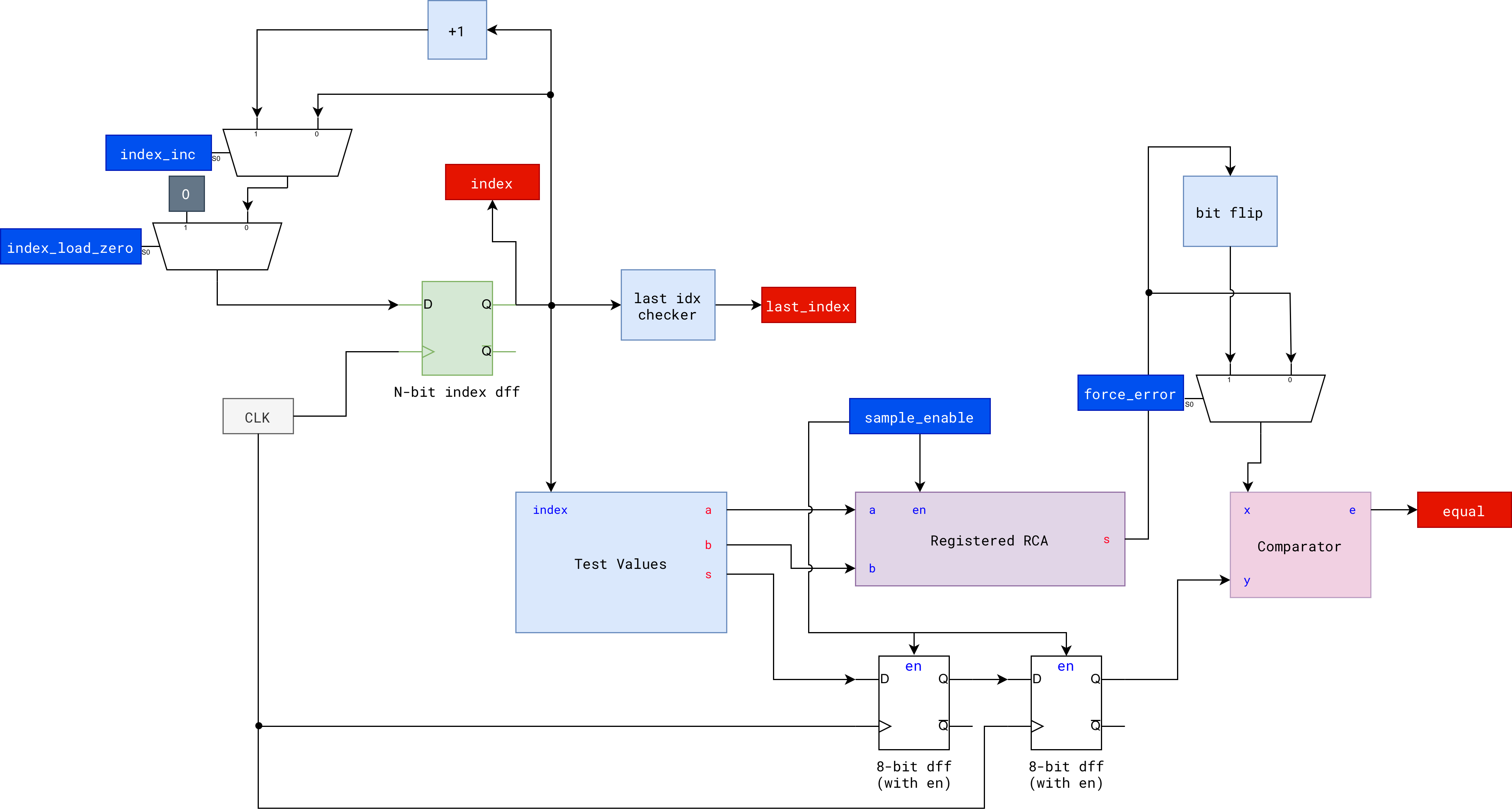 io_button[0]is used to start/restart the testerio_dip[2][7]will force bit-flip the adder’s output and induce and error, to demonstrate that our tester can show error. This is a forced error.- Once error is induced, the tester stops at the test-case index of that error
