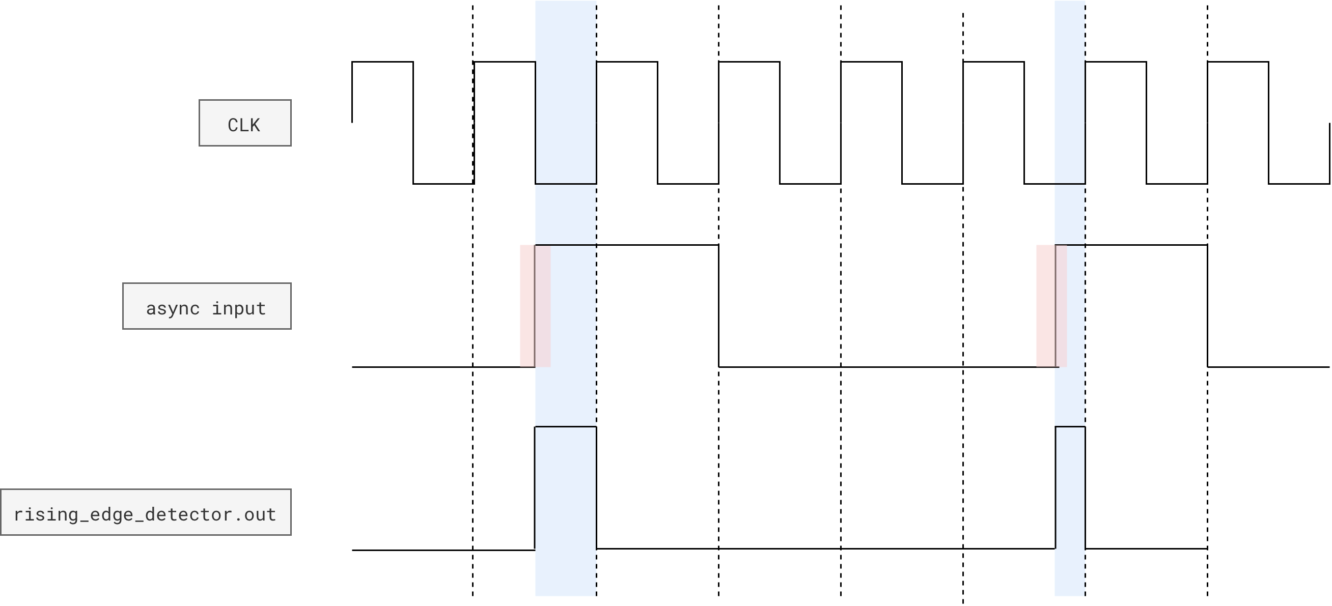 So with a synchronous input the pulse is exactly one full clock period long, aligned with the cycle where the edge happened.