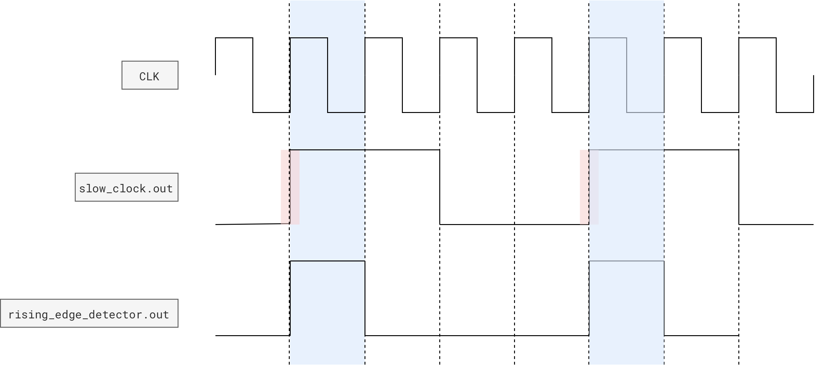 in == 1 && last.q == 0is true, sooutbecomes 1. outstays 1 for the whole cycle, until the next rising edge updateslast.qto 1. After that,in == 1 && last.q == 0is false again, sooutgoes back to 0.