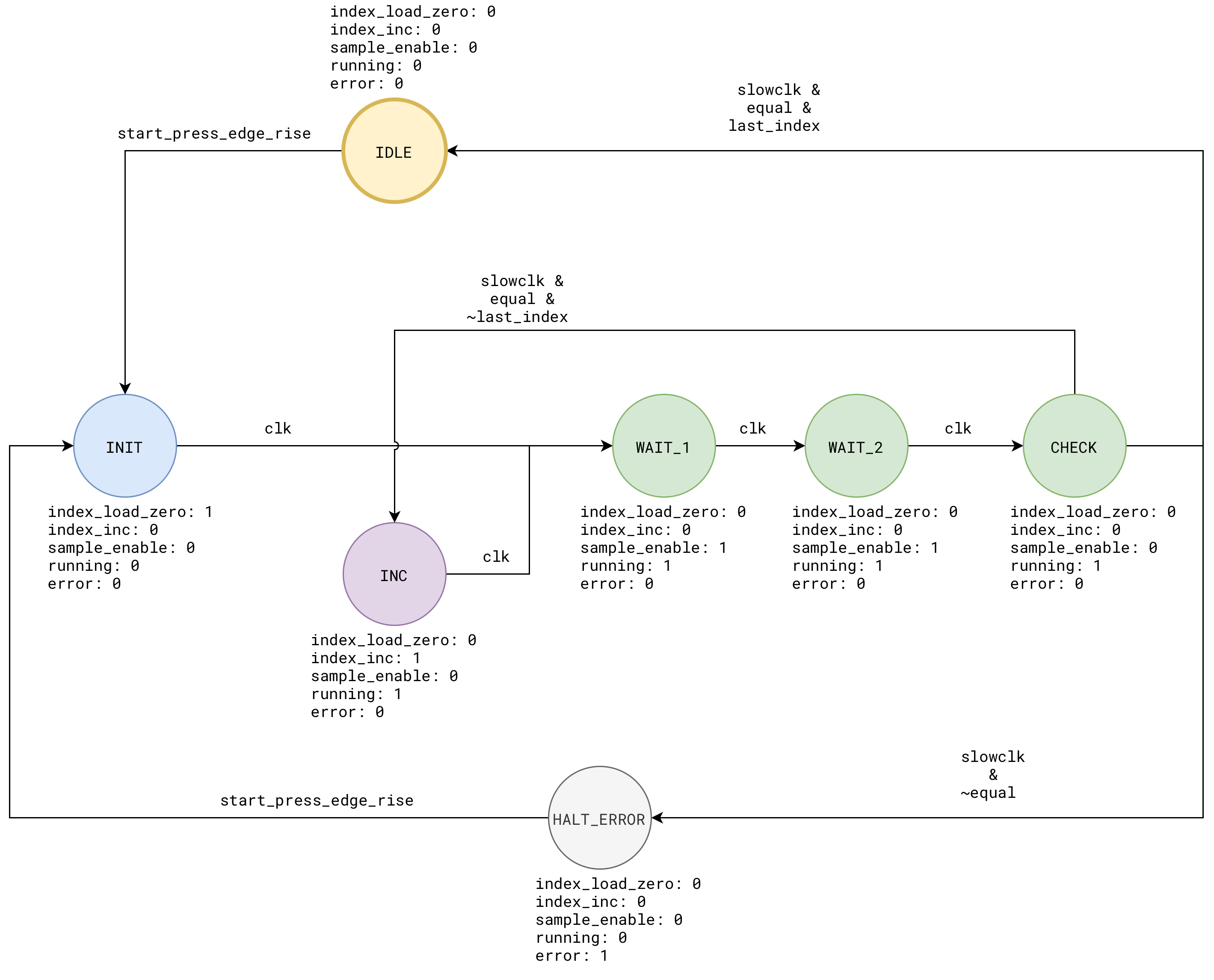 slow clock,edge detector, andbutton conditionerto control transitions cleanly on hardware. - Build an automated tester that increments test cases, samples inputs over multiple cycles, compares pipelined outputs, halts on mismatch, and restarts reliably via a button press.