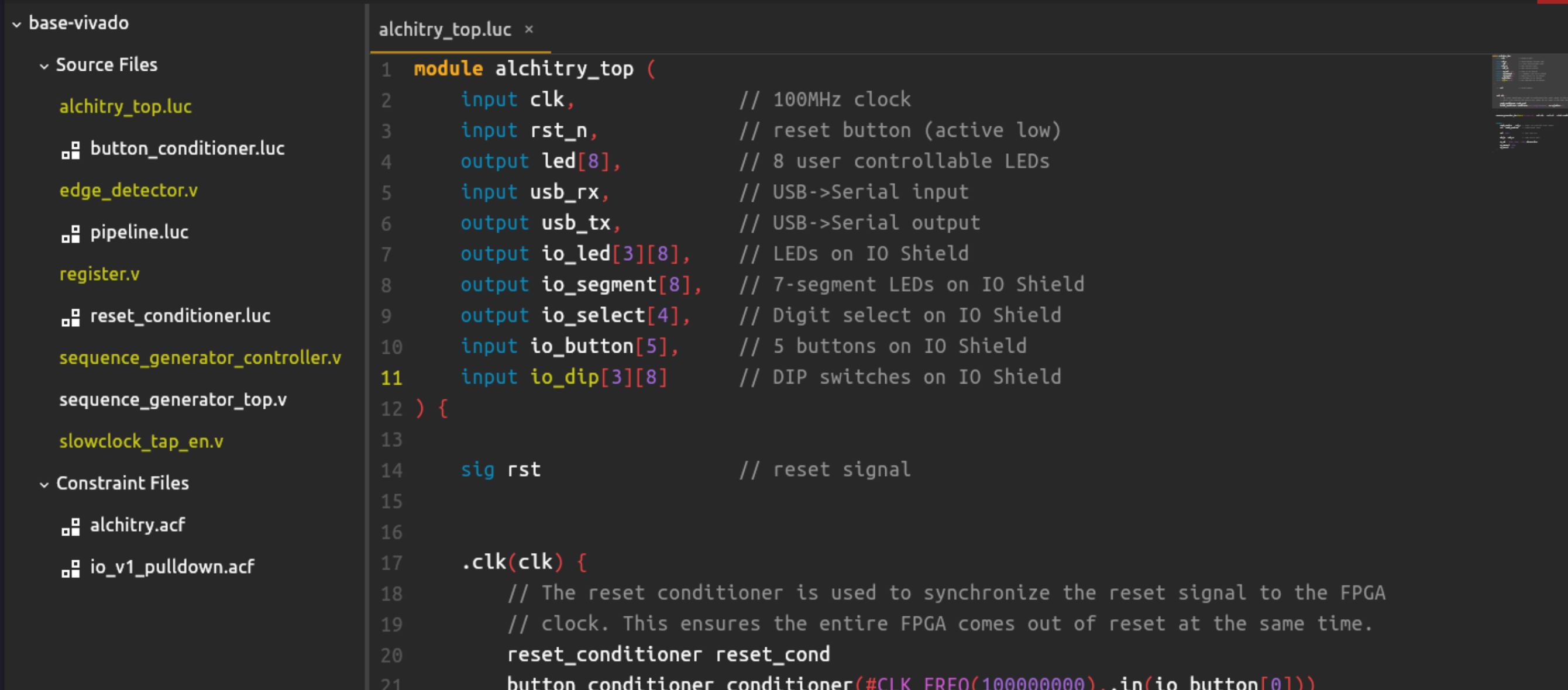 Finally, you need to connect your verilog top module into alchitry_top. This is one example: