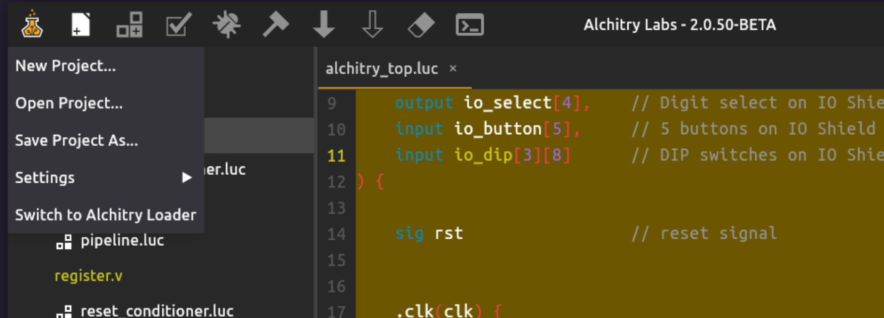 - Alchitry Labs V2: A project manager and frontend that integrates with Vivado. It handles pin constraints, board definitions, IO shields, and loading the final bitstream onto the FPGA.