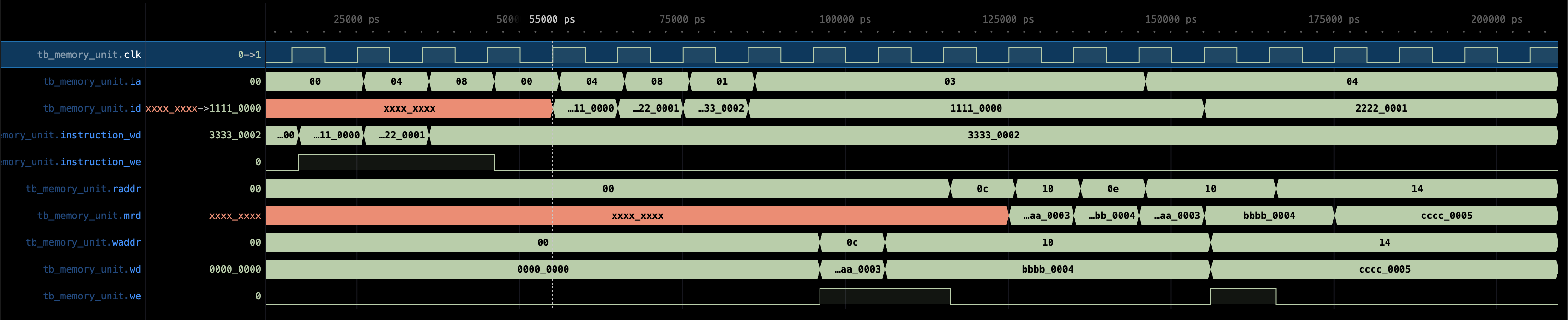 We expect byte addresses to be supplied at ia, raddr, and waddr. However, our RAM blocks store 32-bit words, so the memory unit is word-aligned internally.