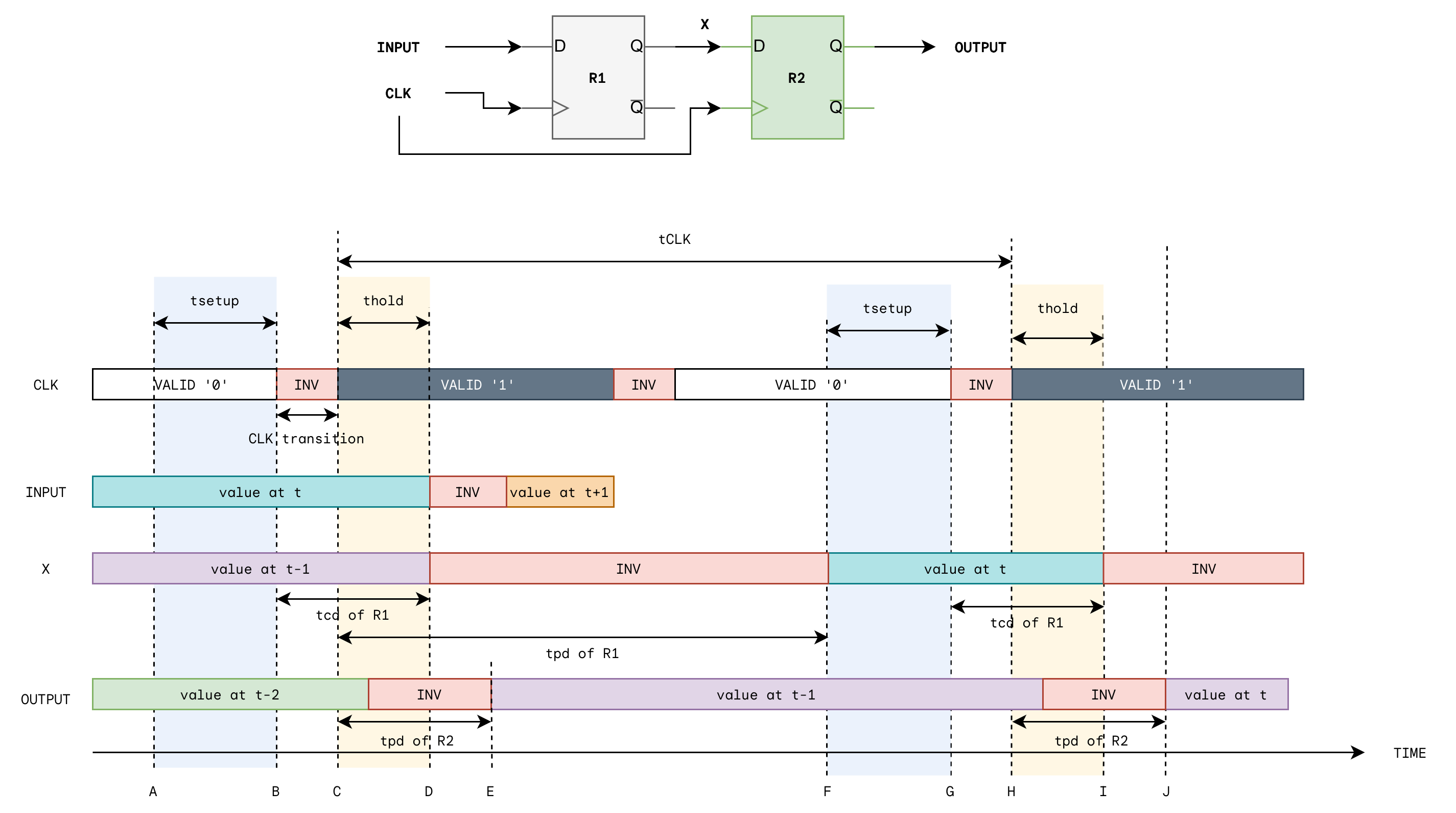 - The devices upstream of R2 has to help to hold on to this old \(t_{i-1}\) values for the \(t_H\) of R2 to be fulfilled before responding to the rising edge of the clock and producing new values.