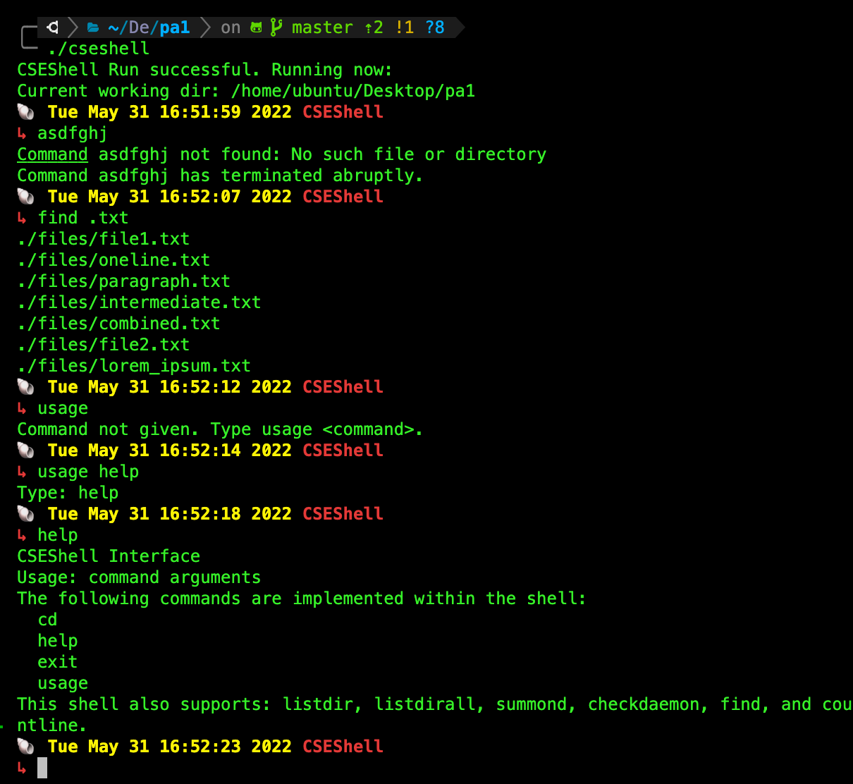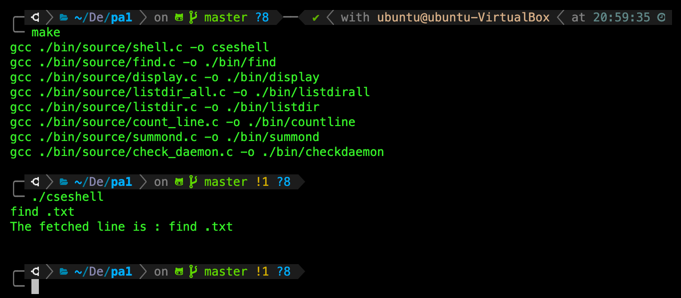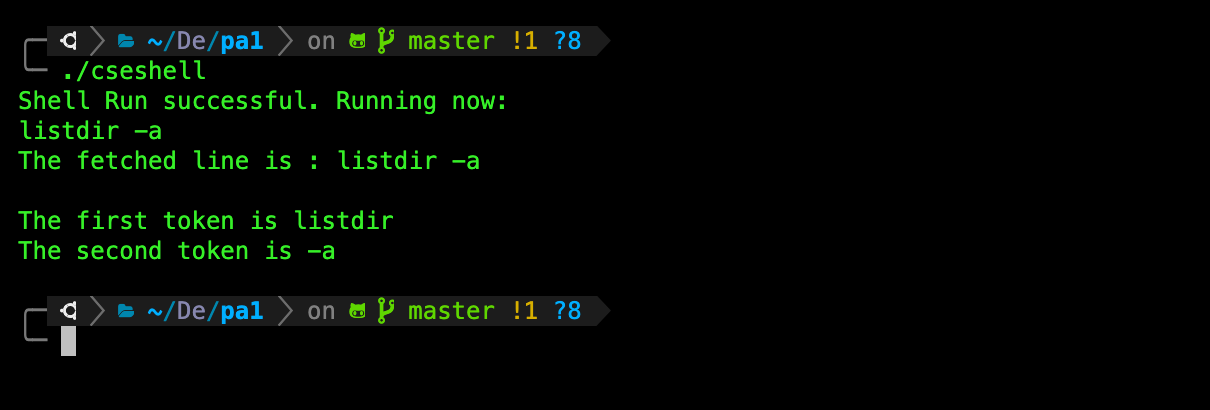 tokenize_line_stdin(char *line)as the input toprocess_command(char **args), where we execute the appropriate system program or builtin shell commands. Of course you need to code a way to terminate the shell, i,e: jumps out of the loop when a user typeexitonto the terminal. This is done by callingshell_exitfunction that’s already implemented for you.