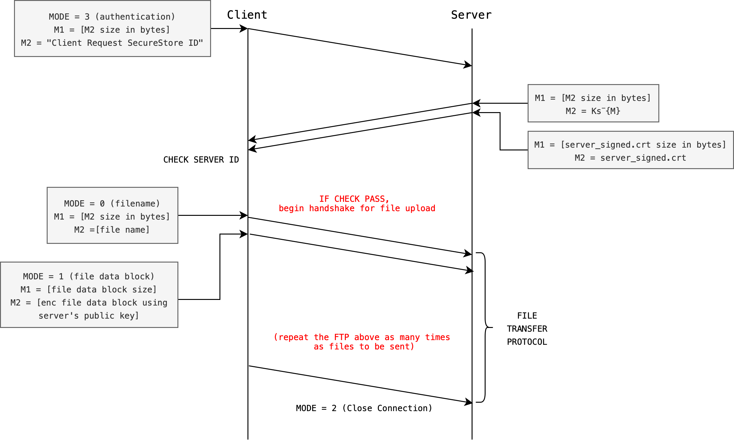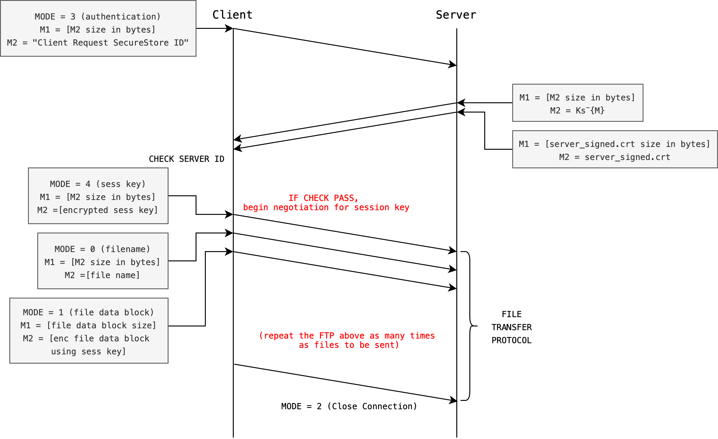 0: client will sendM1: size of filename, andM2: the filename (no need to modify, don’t need to encrypt this)1: client will sendM1: size of data block inM2, andM2: encrypted blocks of data using the session key. The server has to decrypt it with the session key as well before writing it to file (NEW for Task 3)2: client closes connection (no need to modify, same as original)3: client begins authentication protocol as per Task 1 (no need to modify, same as AP in Task 1)4: client begins sharing of session key protocol (NEW for Task 3)