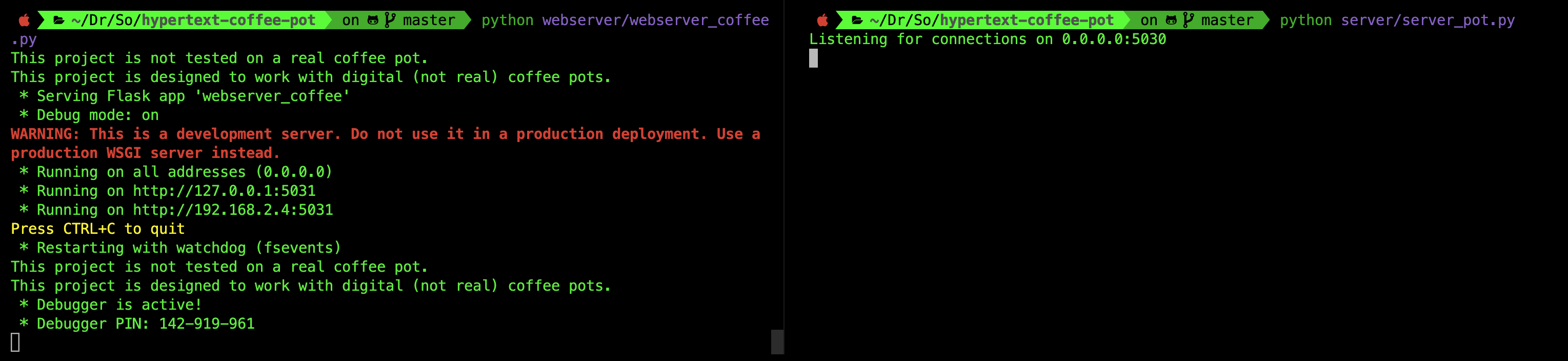 You can them on two separate terminal sessions. First, spawn the coffee pot server: