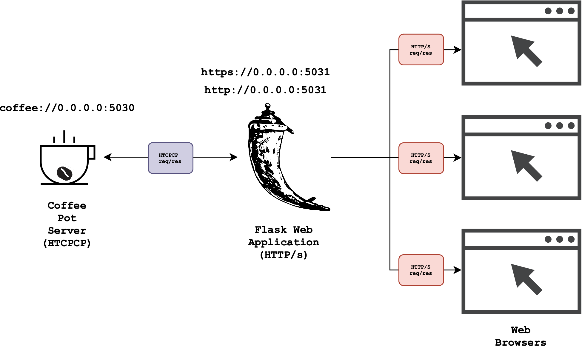 coffee://URI scheme (instead of http or https). - A full-stack web application (using Python Flask) that serves a regular HTTP-based web client and also help you send HTCPCP requests to the coffee pot server using your web browser.