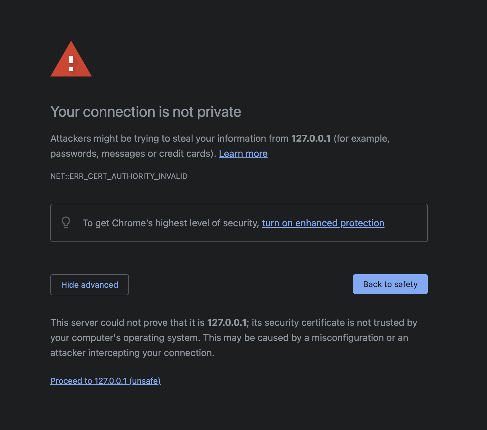 When you try to access the webpage on your browser, e.g: https://127.0.0.1:5031, there might be warning as such: