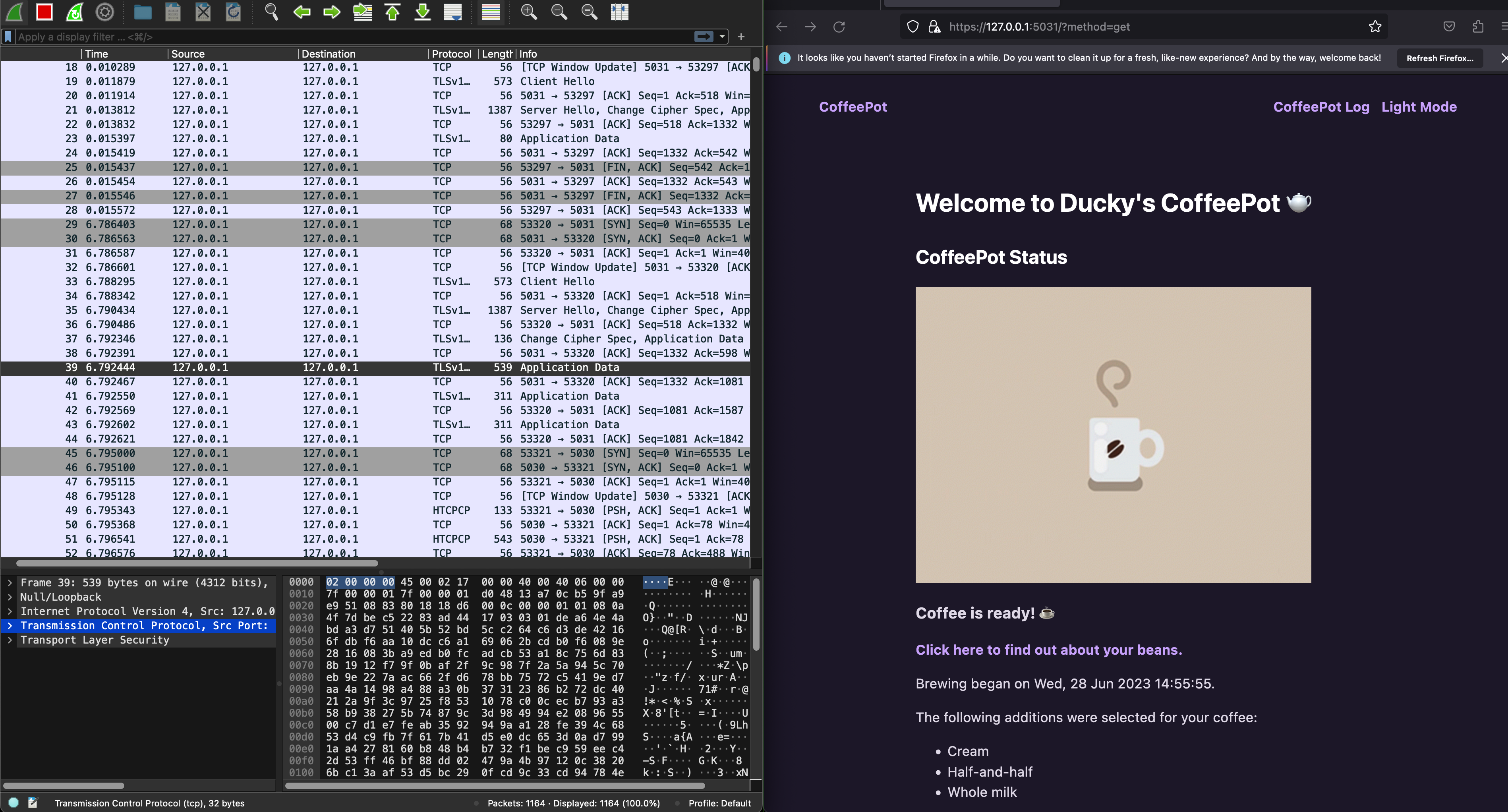 You can just click proceed anyway, and you should be able to view your webpage as per normal. However this time round, when you open Wireshark and sniff your loopback channel while loading the CoffeePot homepage, all packets are encrypted and wireshark will not be able to decode https packets. It will all appear as TLS packets, with encrypted application data: