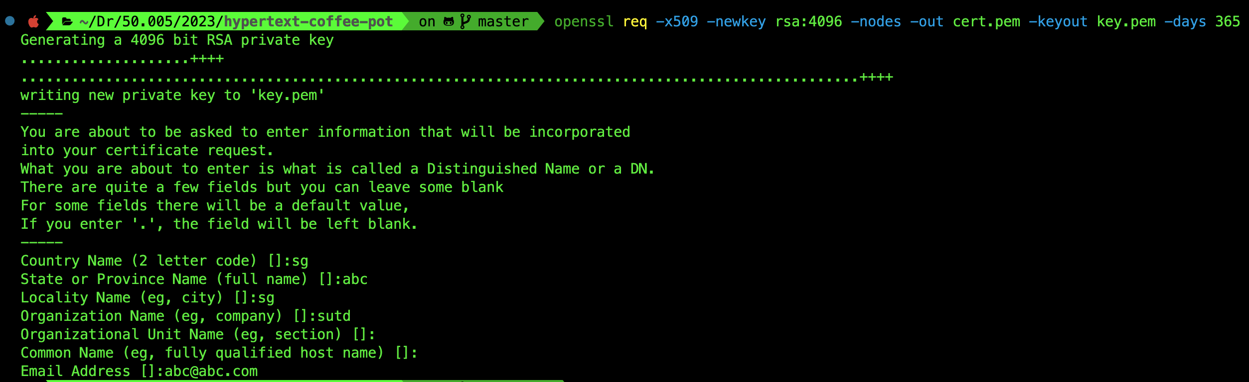 openssl req -x509 -newkey rsa:4096 -nodes -out cert.pem -keyout key.pem -days 365