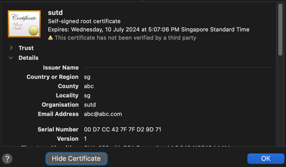 When you inspect the certificate on your browser, you will notice that it will show the details you keyed in earlier: