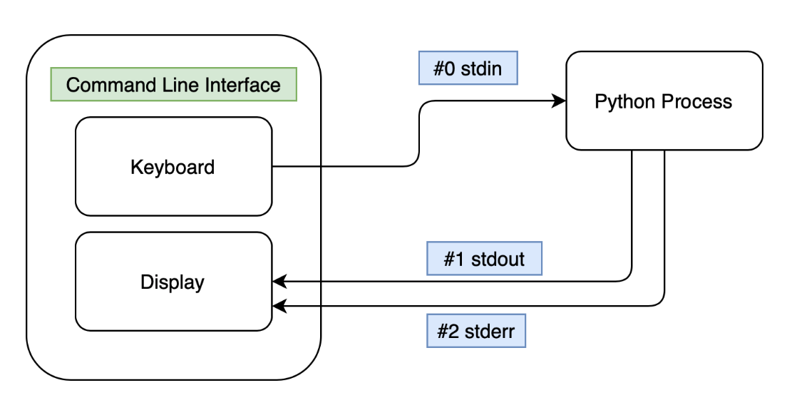 - Output from your python process is passed back to your terminal display. Here’s a simplified illustration: