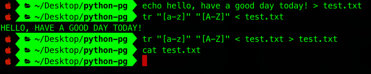 tr "[a-z]" "[A-Z]" < test.txt > new_test.txt. You should find that “HELLO, HAVE A GOOD DAY TODAY!” exists withinnew_test.txt, since we redirectstdoutto create this new file. - What if we want to write back to