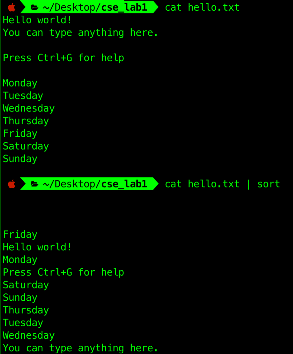 catcommand as the input ofsortcommand. We can’t do this with redirection: