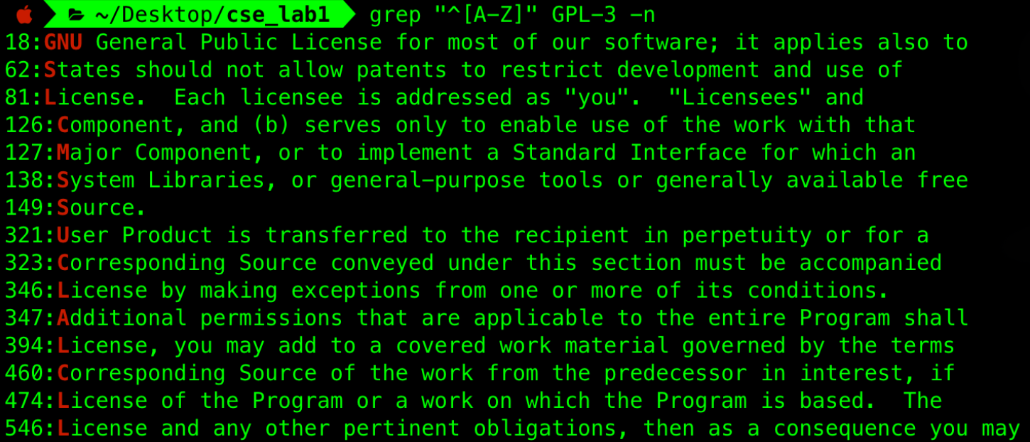 grep "^[A-Z]" GPL-3 -n- This search for every line starting with capital letters