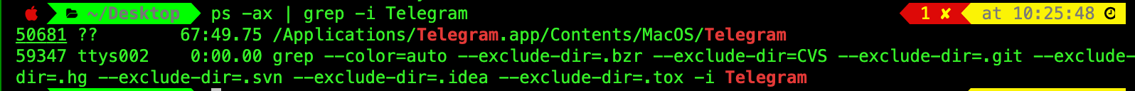 You can also pipe the output of a command to the grep command so that you can filter it out. For example, ps -ax will report all running processes in your system (by all users, including your own). If we want to filter some processes by name, we can use grep and pipe to filter the Telegram process: ps -ax | grep -i Telegram