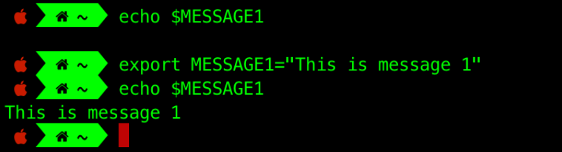 In the example below, the environment variable $MESSAGE1 initially did not exist. After we export it, we can now print the environment variable $MESSAGE1.