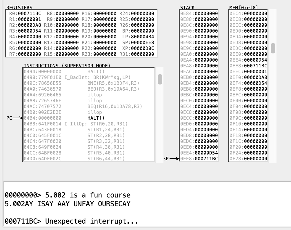When you click the mouse over the console pane, BSim generates an interrupt, forcing the PC to 0x80000010 (remember the interrupt vector?) and saving PC+4 of the interrupted instruction in the XP register. We paste the interrupt vector here again for your reference. Interrupt vector is hardwired in the CPU: