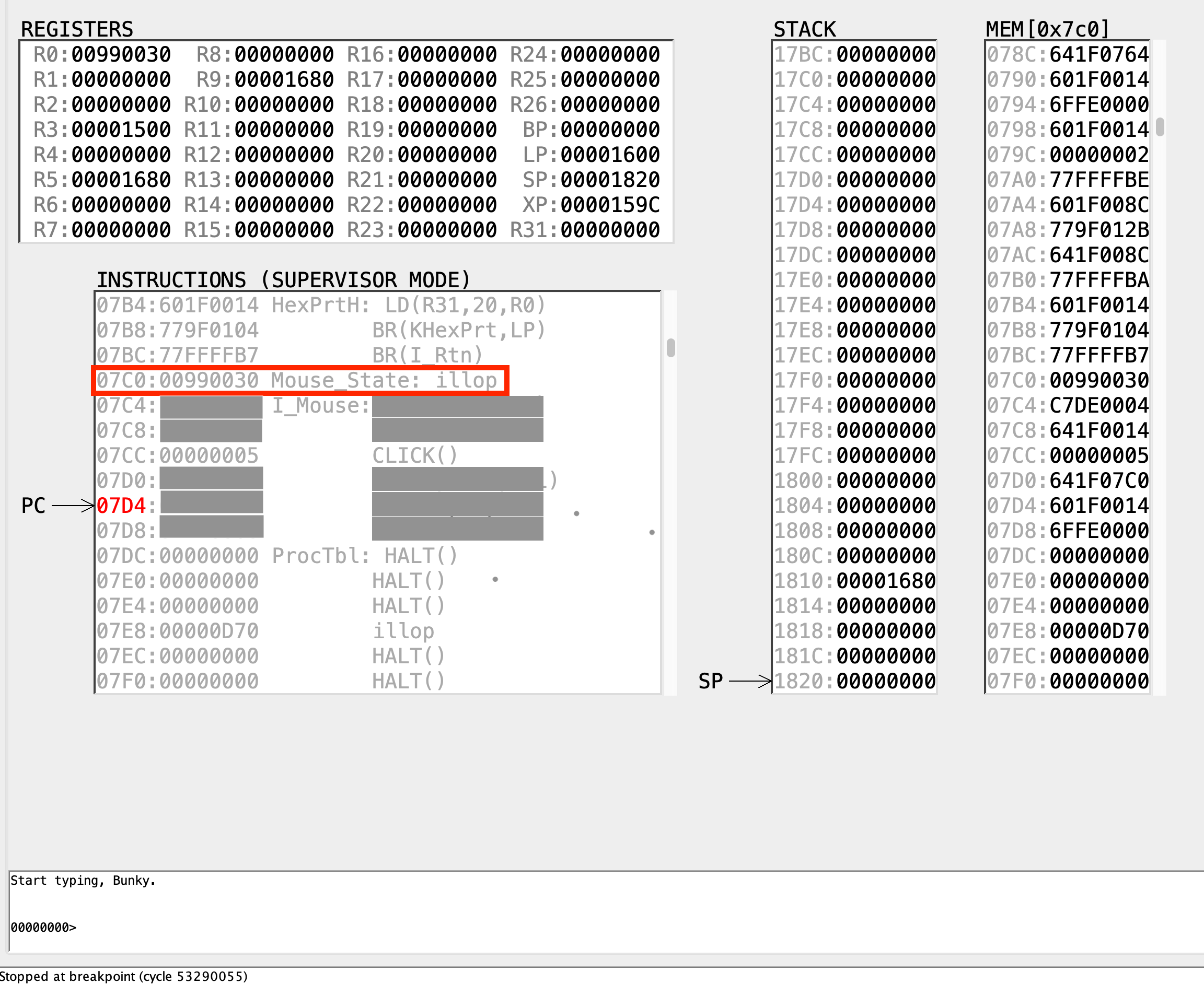 If things are working correctly the simulation should stop at the breakpoint and you can examine the kernel memory location where the mouse info was stored to verify that it is correct. In the sample below, we name the memory location as Mouse_State, and the value in the red box signifies the coordinates of the mouse click made in the console pane.