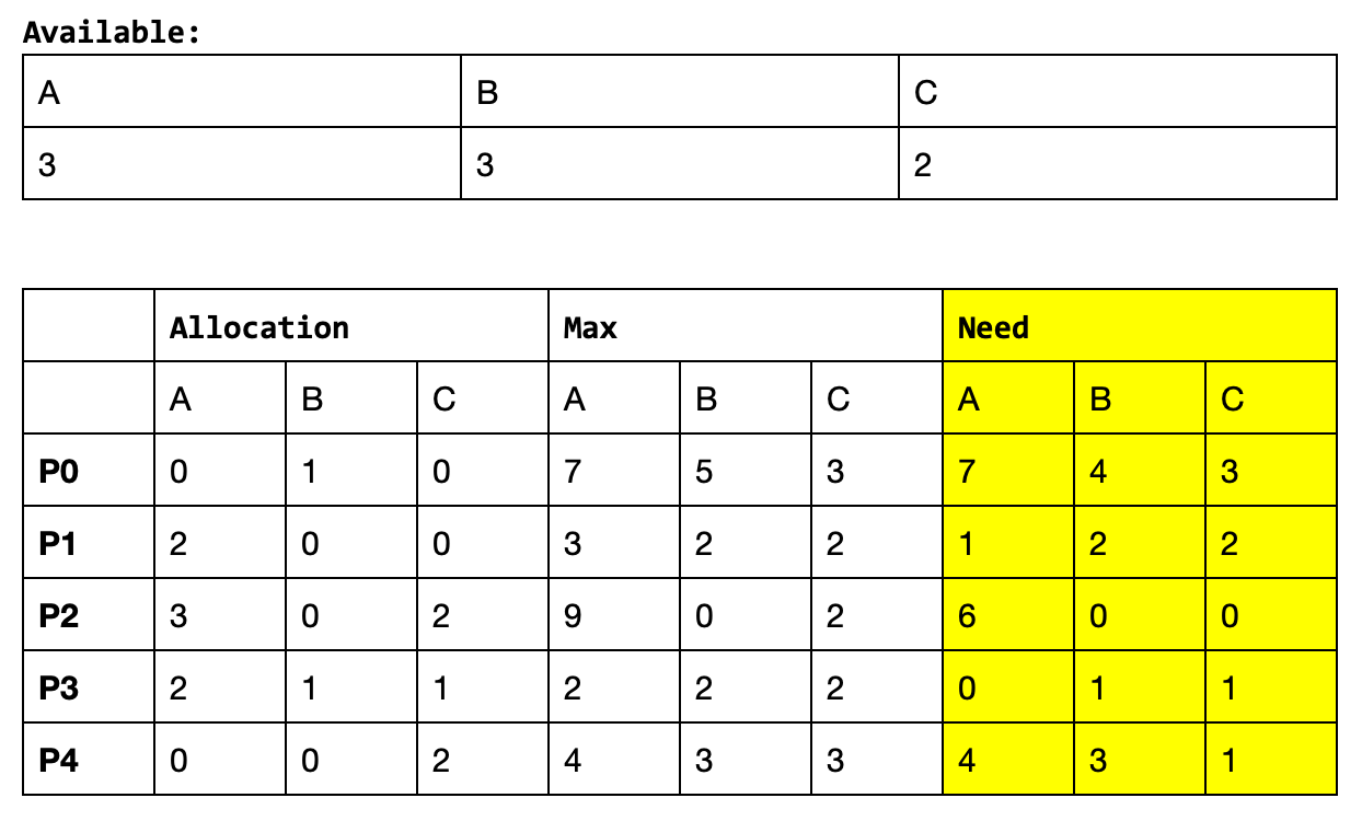 For example, the following arrays display the available, max, allocation, and need values of a current state of a system with 5 processes: P0, P1, P2, P3, and P4, and 3 types of resources: A, B, C;