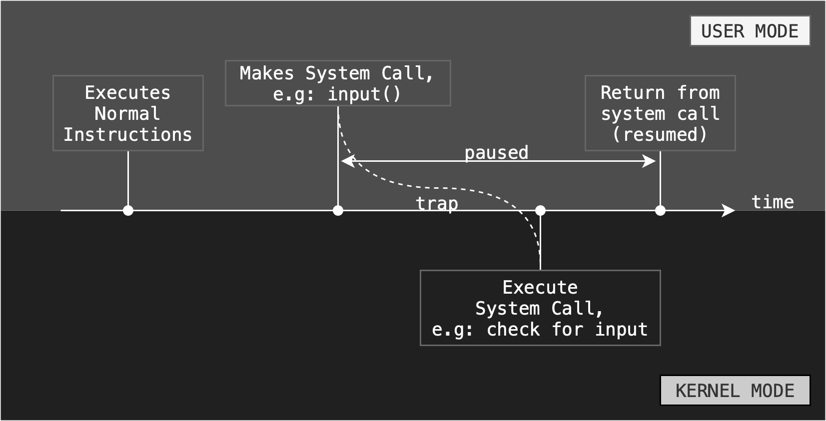 input()) for this input (e.g: mouse click), that process will be labelled as ready. For example, if the application is blocked upon waiting for this new input, then the system call returns. We will learn more about this in Week 3.