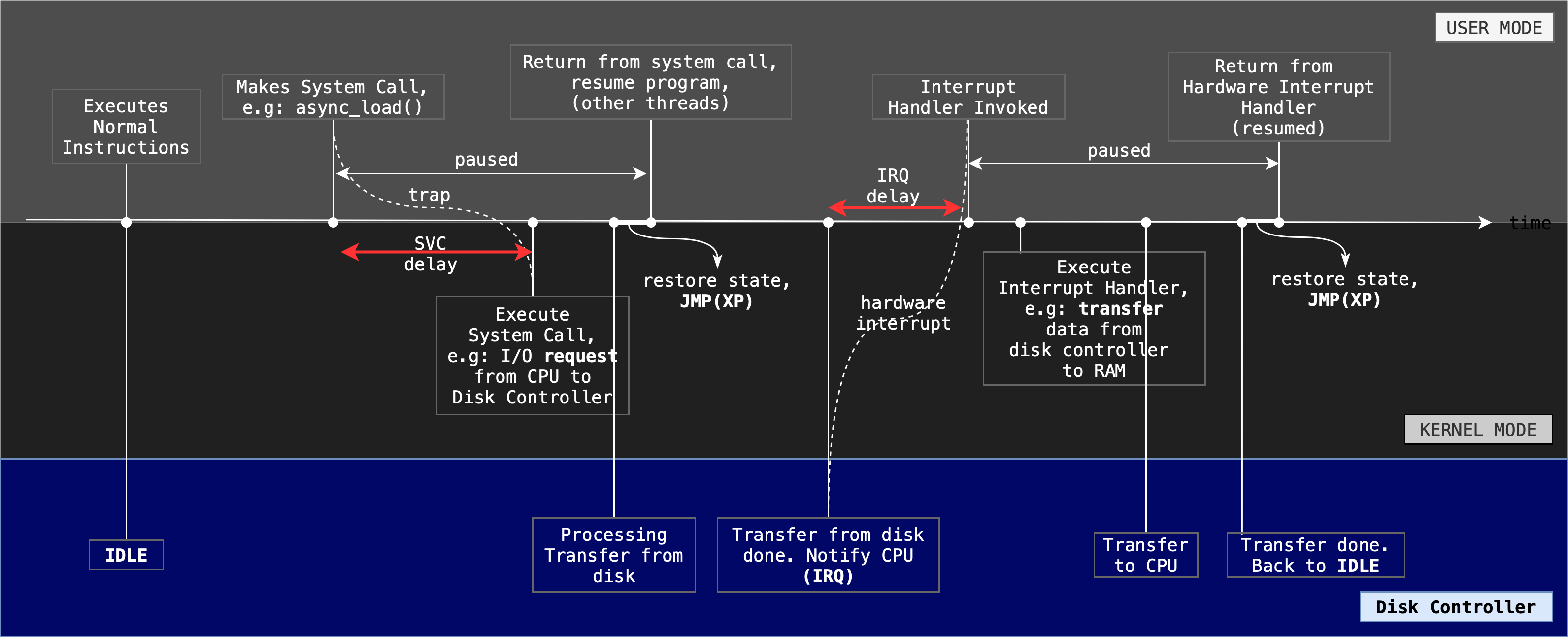 In the example of Process 1 and 2 above, assume a scenario whereby there’s a periodic scheduler interrupt to check which Process may resume next. Assume that Process 1 is in the middle of handling its async_load system call when the timer interrupts.