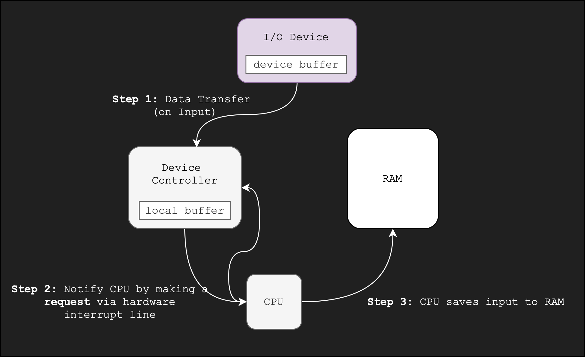 When there’s new input: from external events such as keyboard press, mouse click, mouse movement, incoming fax, or completion of previous I/O requests made by the drivers on behalf of user processes, the device controllers will invoke an interrupt request by setting the bit on this interrupt-request line.