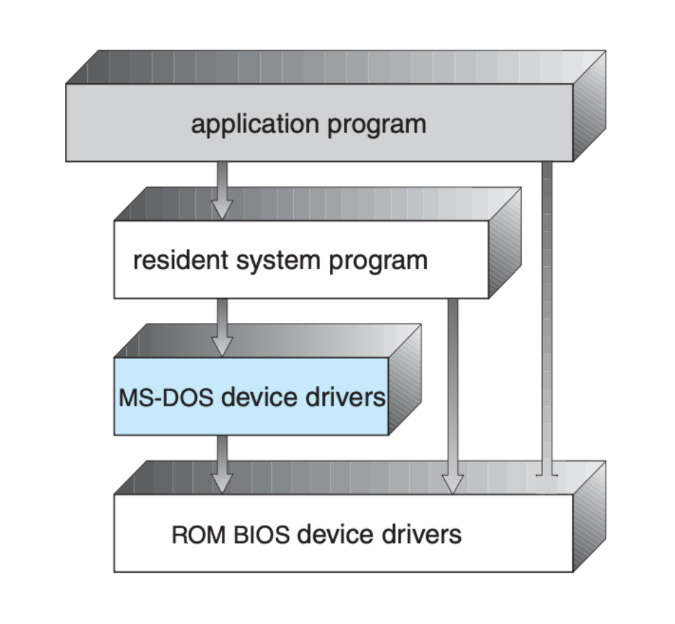 The figure below (screenshot from SGG book) shows the structure of MS-DOS, one of the simplest OS made in the early years: