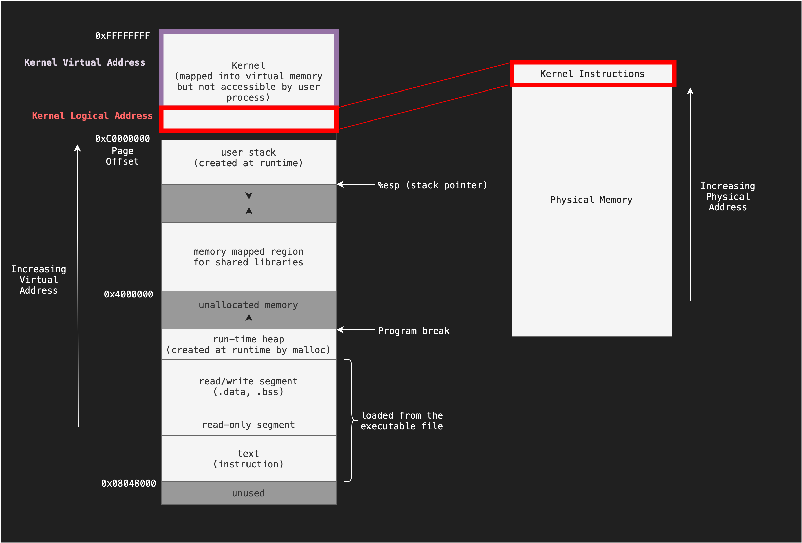 The kernel mapping part exists primarily for the kernel-related purposes, not user processes. Processes running in user mode don’t have access to the kernel’s address space (with different MSB), at all. In user mode, there is a single mapping for the kernel, shared across all processes, e.g: fixed address between 0xffffffff to 0xC0000000 as illustrated above.