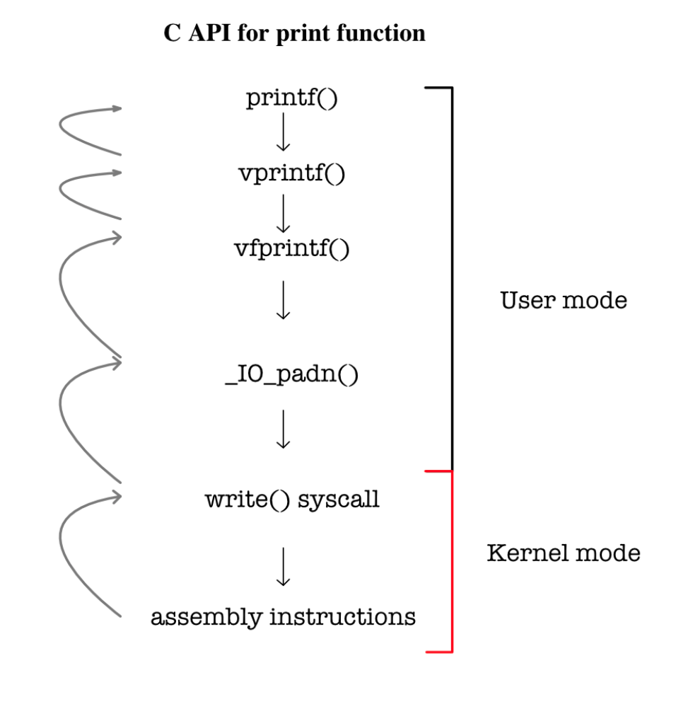 printfis actually making several other function calls to prepare the resources or requirements for this system call and finally make the actual system call that invokes the kernel’s help to display the output to the display.