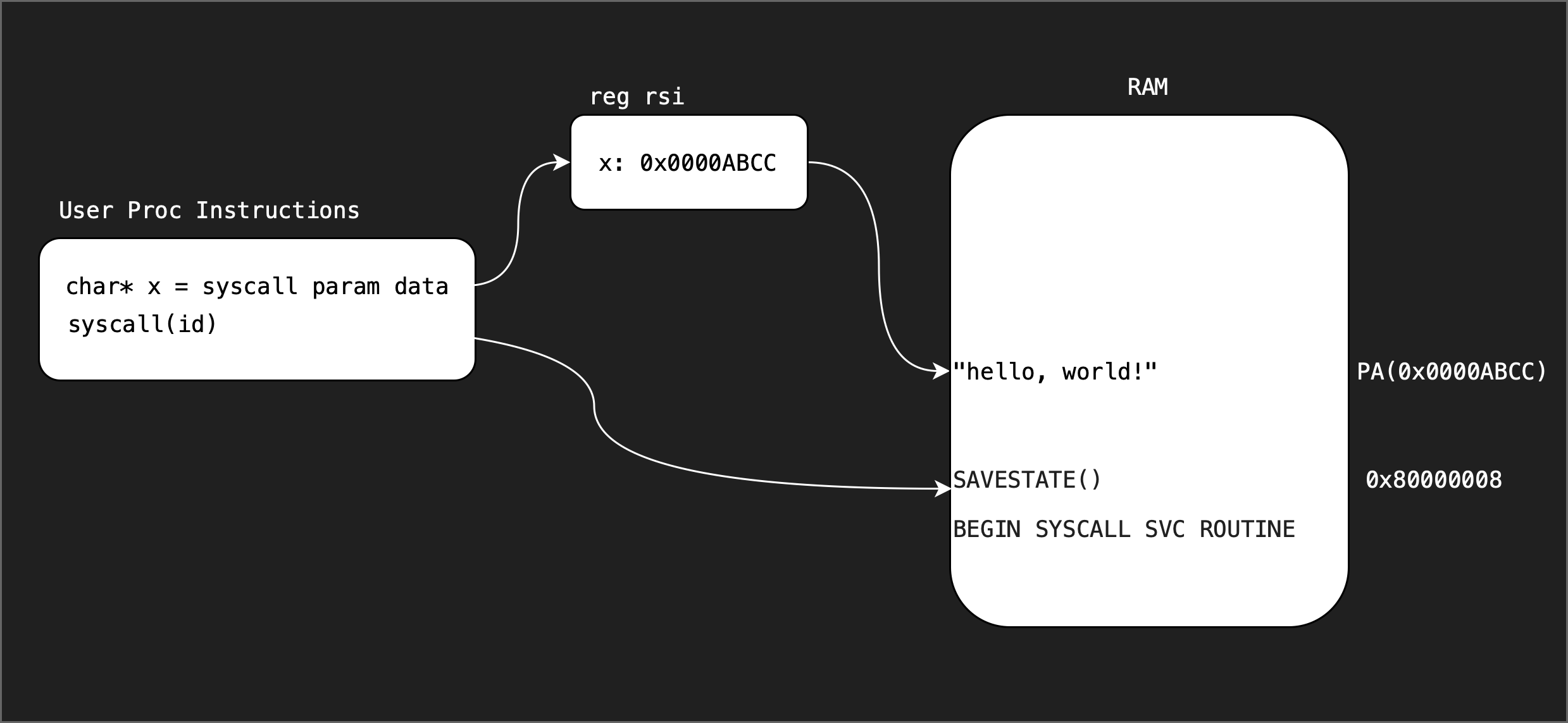 id(e.g:write) is made, the kernel examines certain registers, in this example isrsito obtain the address to the parameter (the bytes to write tostdout) - Given the pointer, Kernel can find the parameter for the system call in the RAM, as illustrated below: