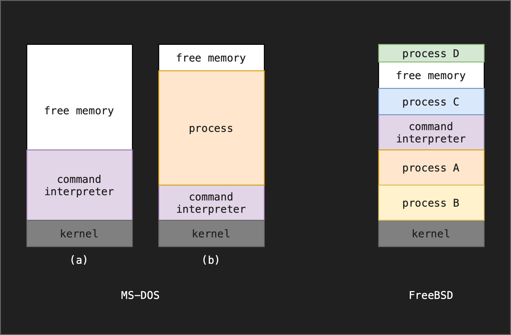 It has a simple command interpreter (that is invoked when the computer is started as shown in the figure above, labeled as (a)). Upon opening a new program, it loads the program into memory, writing over most of itself (note the shrinking portion of command interpreter codebase) to give the program as much memory as possible as shown in (b) above.