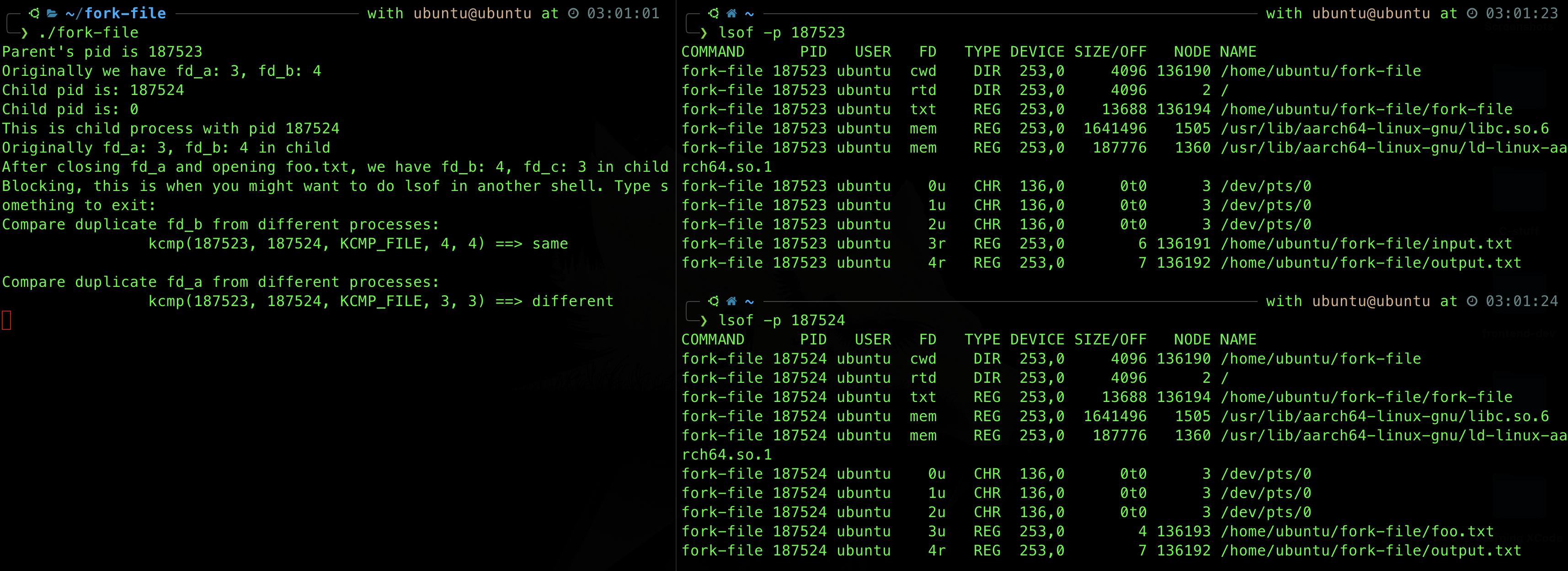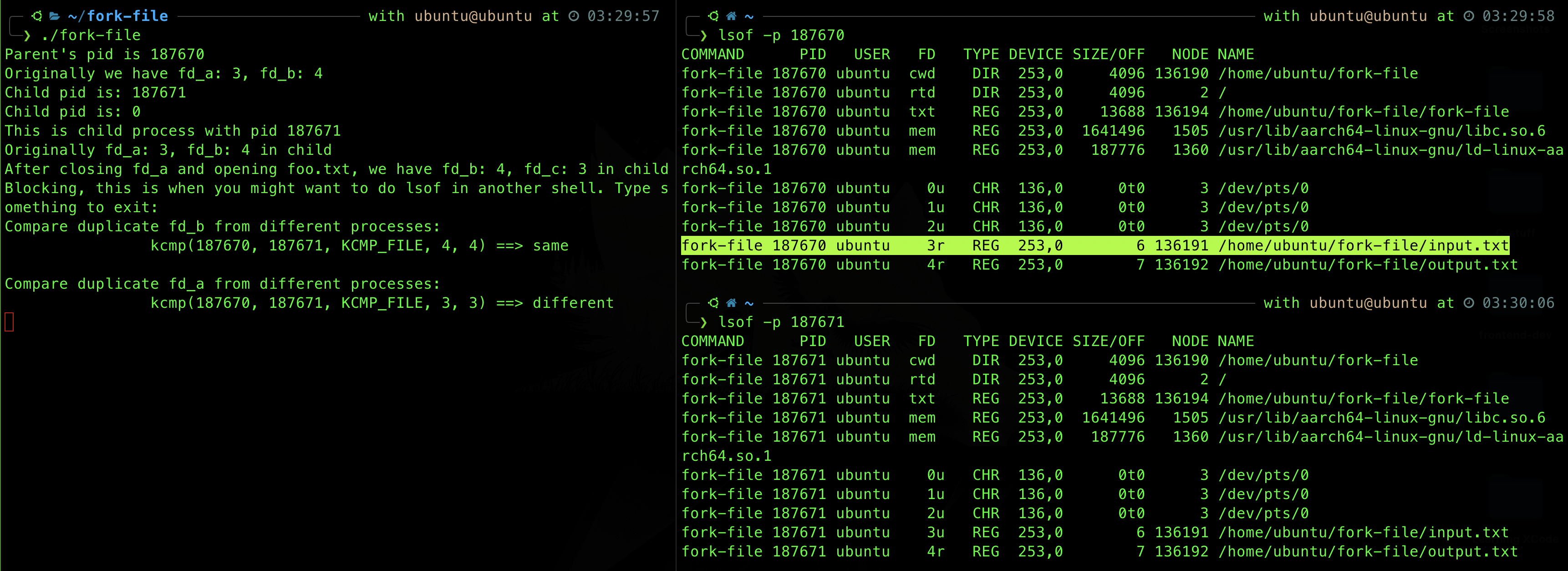 The printout from kcmp confirms that fd_b (fd 4) in both processes point to the same resources (output.txt), but fd 3 (fd_c in child process, and fd_a in parent process) points to different resources (both different open file table entry and different resources). In fact, as long as two processes are pointing to a different open file table entry, kcmp will report it as different resources. You can confirm this by modifying the child process to open input.txt instead of foo.txt, kcmp will still report that they are pointing to different resources: