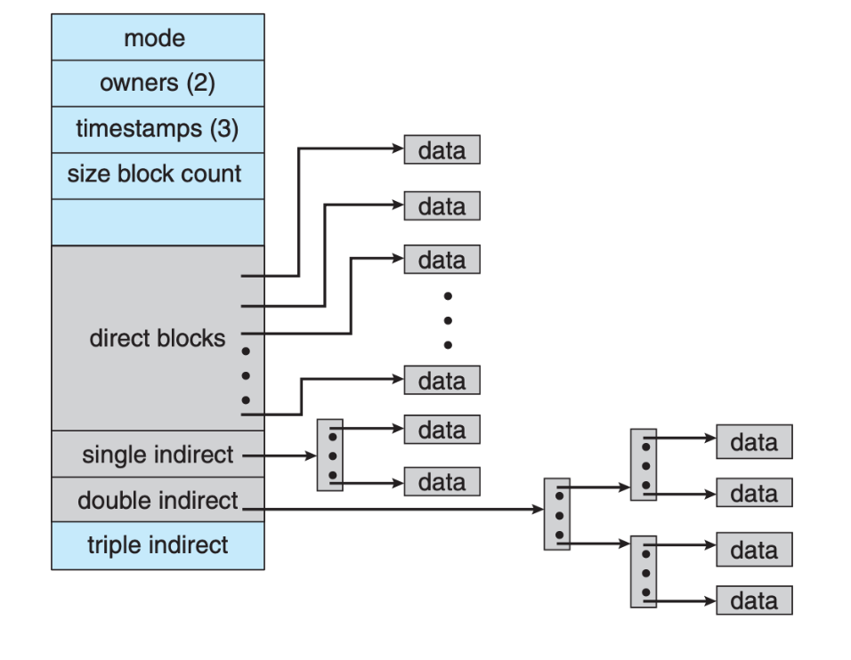 inode table: Contains directory structure and file pointers to the actual data on secondary storage or cached memory