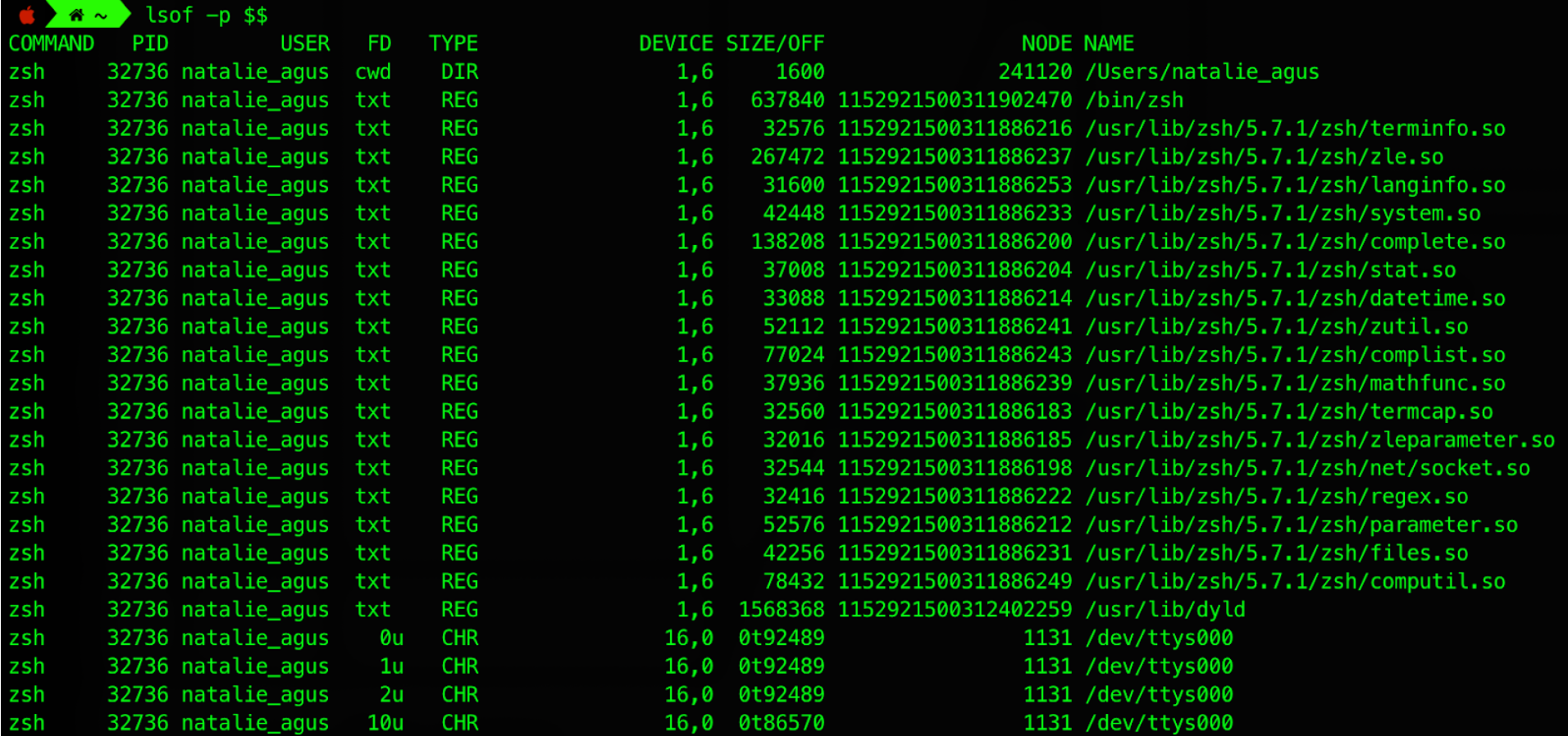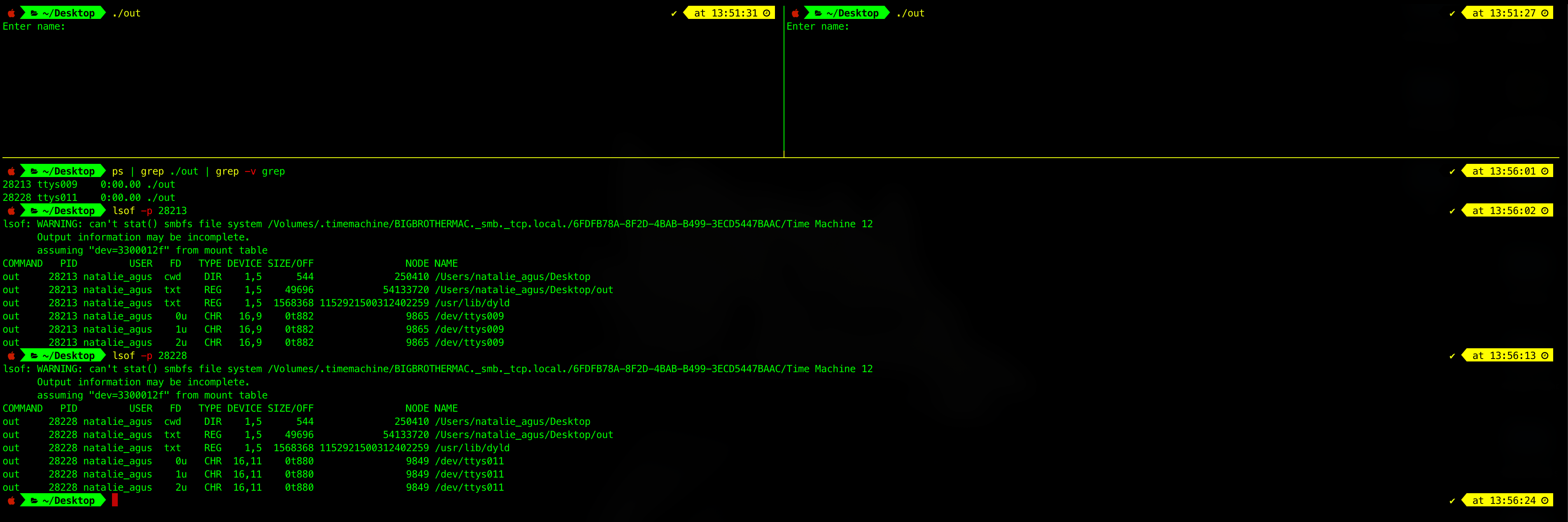 Before both processes exit, we deliberately block both child and parent process with scanf and wait so that we have enough time to investigate the file descriptors of both processes using lsof -p [pid] as follows: