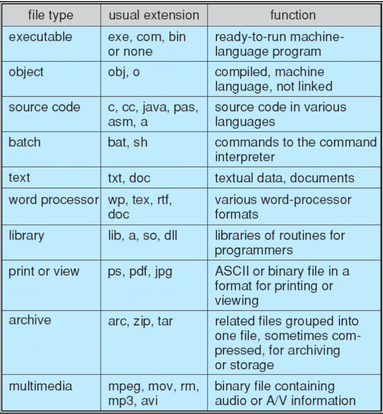 File type is a group of file formats that serve similar functions. For instance: arc, zip, and tar are all the format of archive file type. The image below illustrates the common examples (don’t have to memorise them, image taken from SGG book):