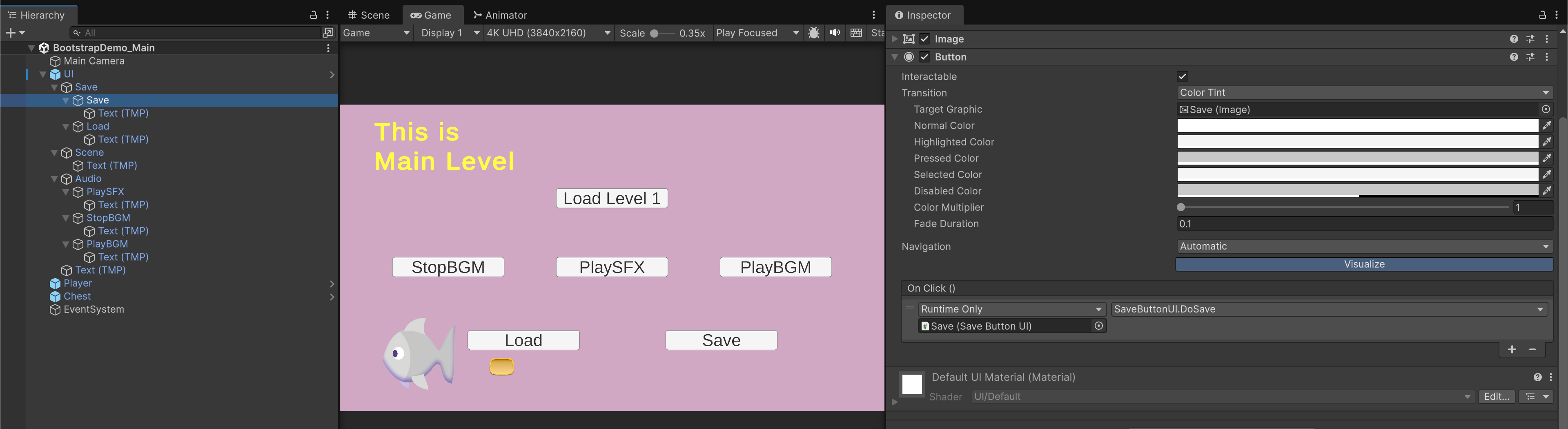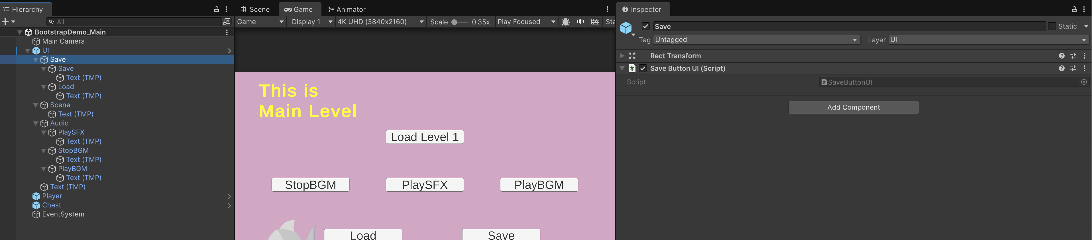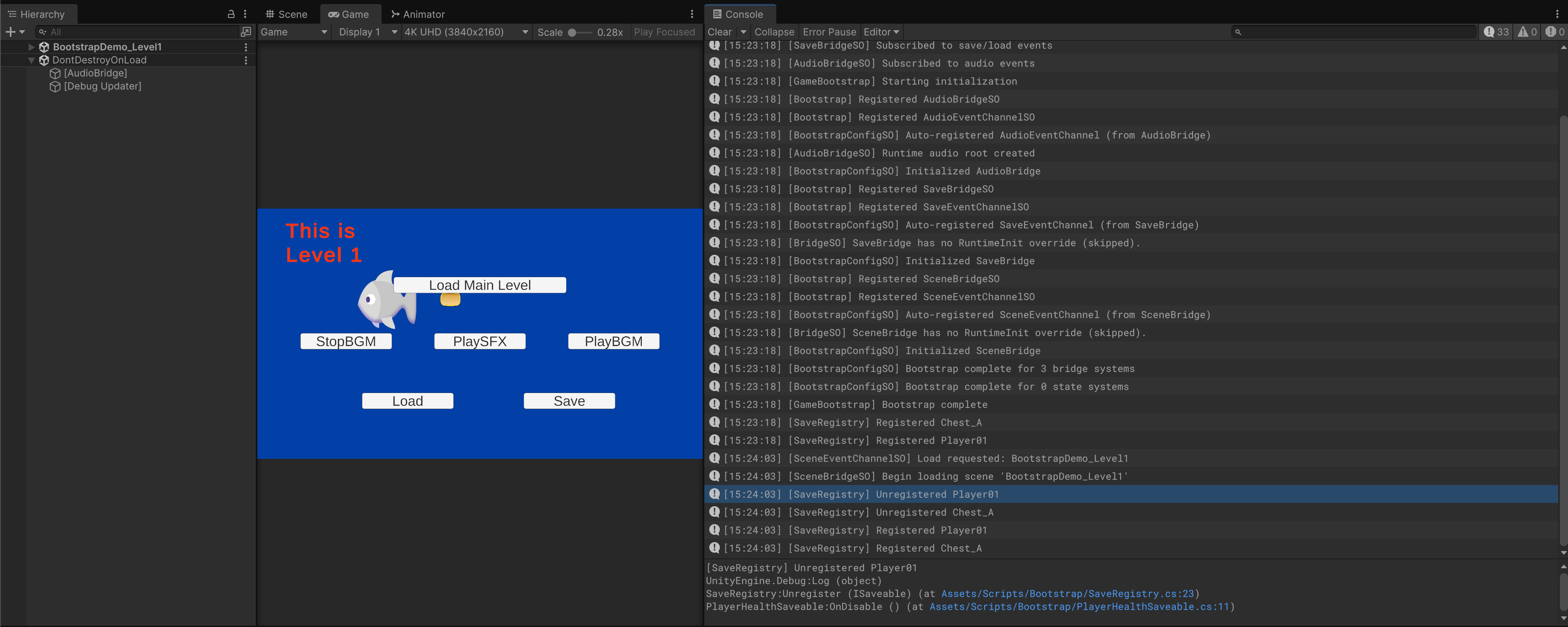 SaveRegistryandISaveable. Buttons raise save/load on theSaveEventChannel,SaveBridgeinvokesSaveRegistry. - Audio: Demonstrates a persistent audio root with two