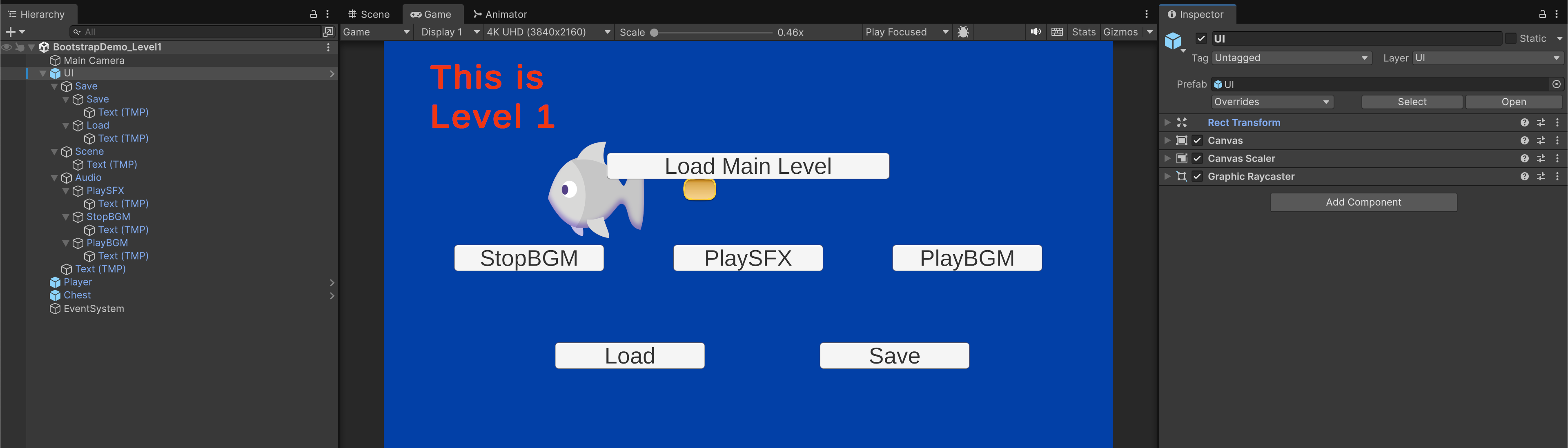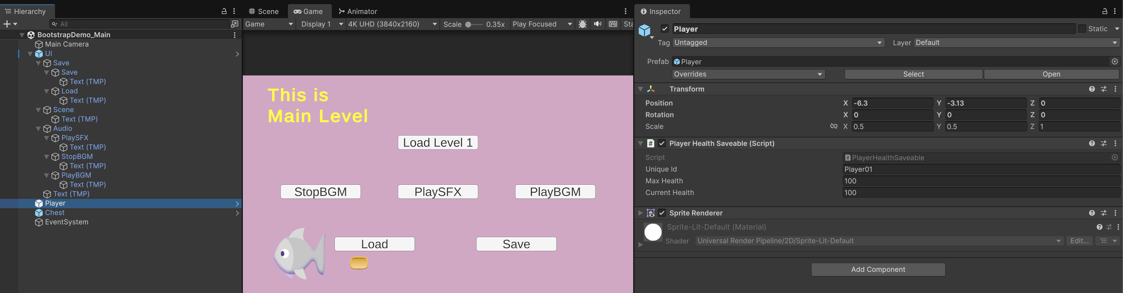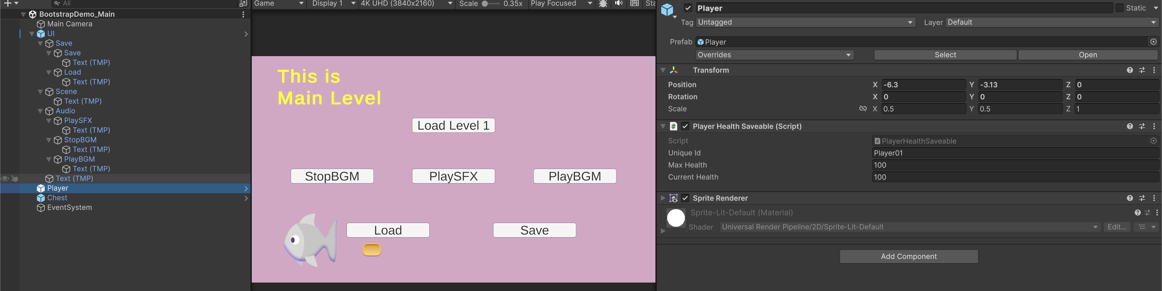SaveRegistryandISaveable. Buttons raise save/load on theSaveEventChannel,SaveBridgeinvokesSaveRegistry. - Audio: Demonstrates a persistent audio root with two