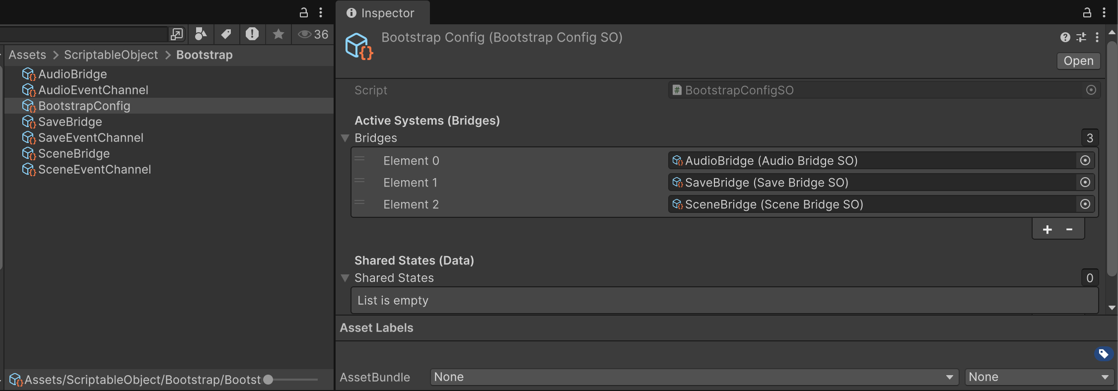 Bootstrap Config SO: registers references to all Bridges and Channels into Bootstrap. InitializeAll() touches each reference to force Unity to deserialize the assets and trigger their OnEnable so subscriptions are active before play.