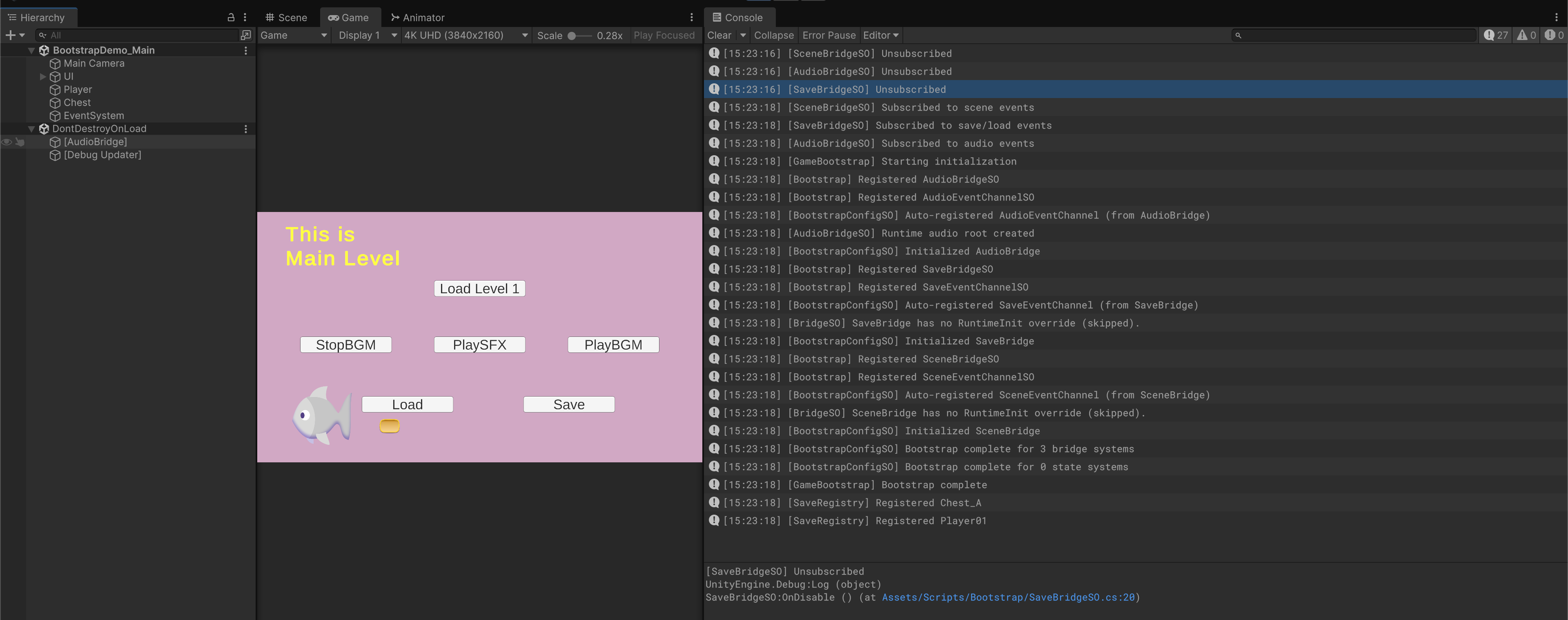 In practice, this means no dragging, no duplicate references across prefabs, and no confusion about which instance of GameStateSO or AudioEventChannelSO is active. One bootstrap initializes everything once; every other script simply resolves and uses it.