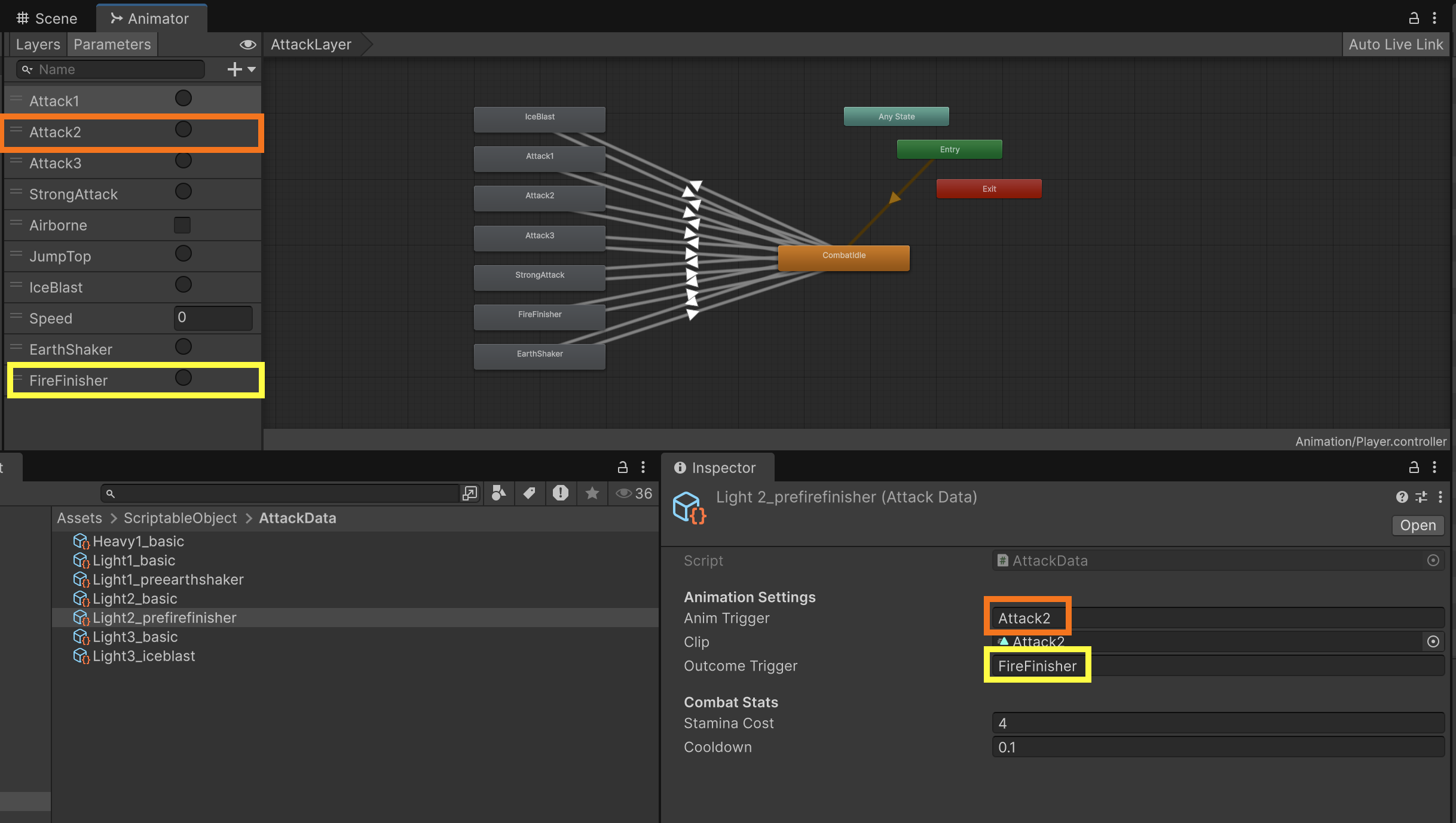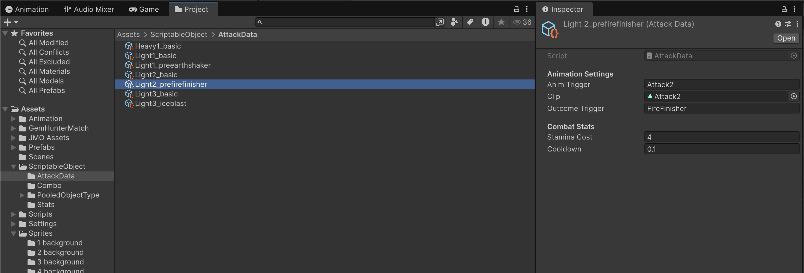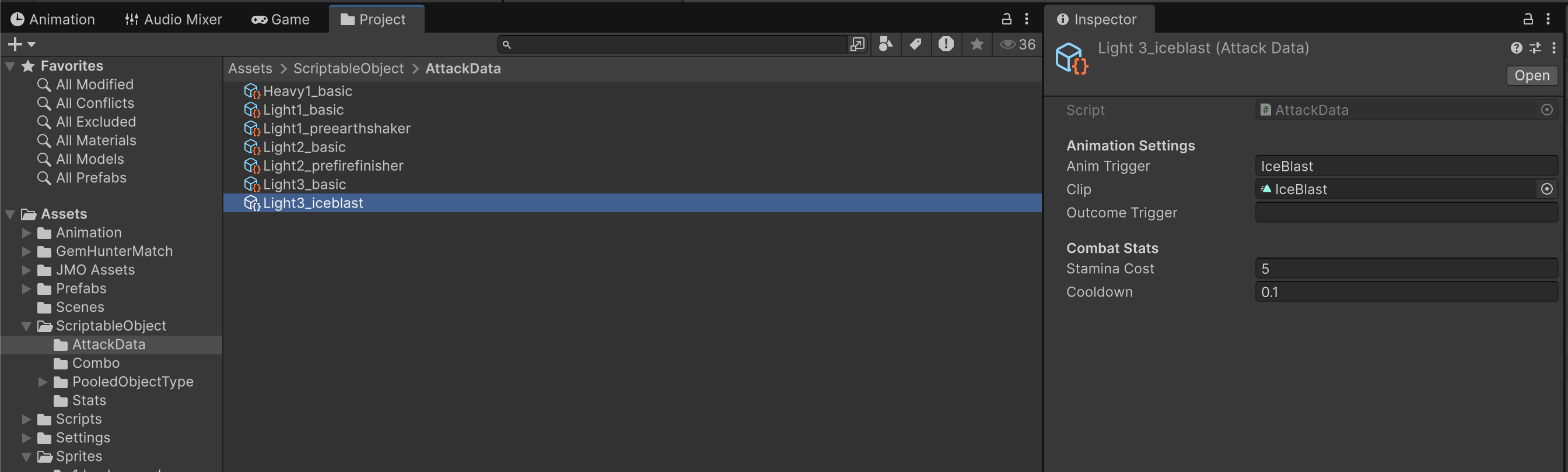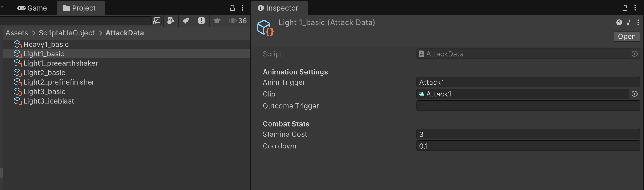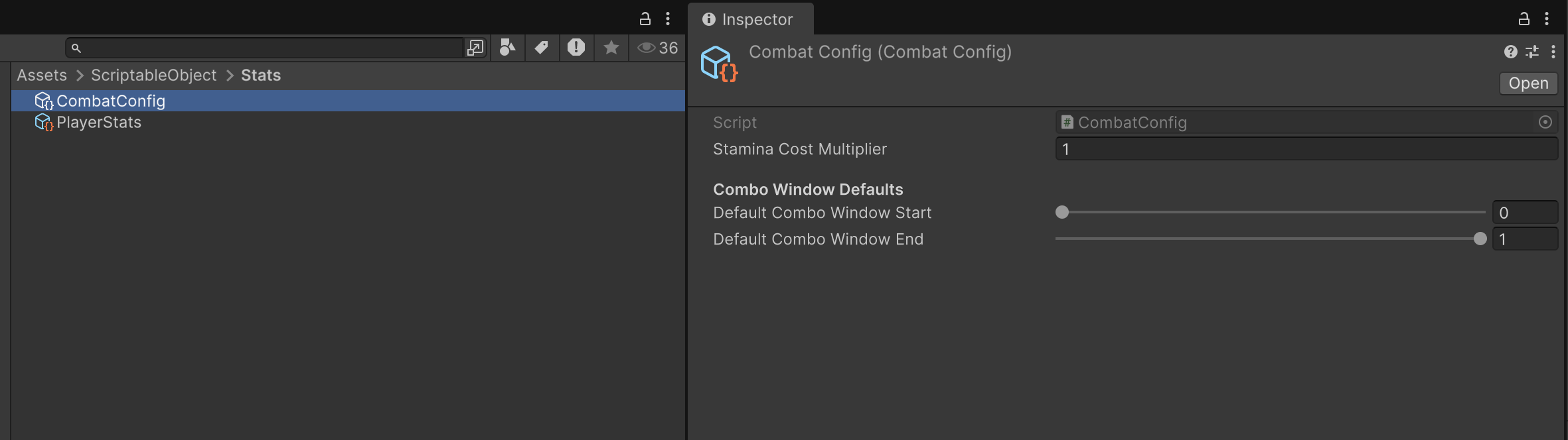 Data | Asset (ScriptableObject) | Defines what attacks exist, how long windows last, stamina costs, animation triggers. |