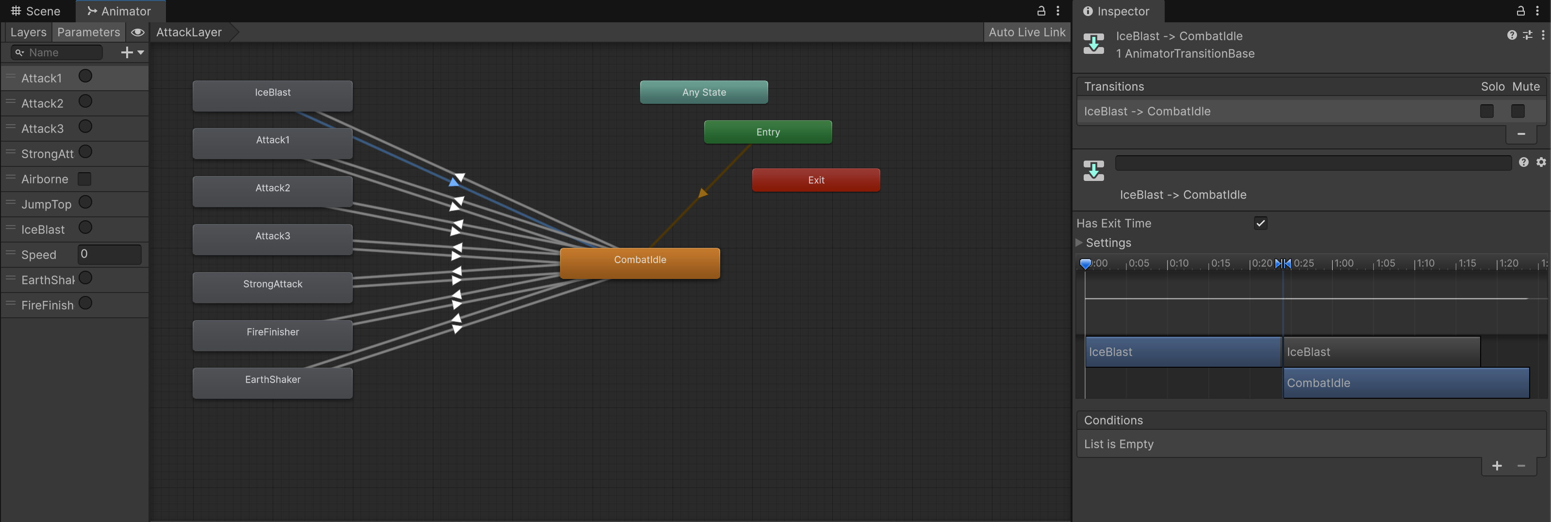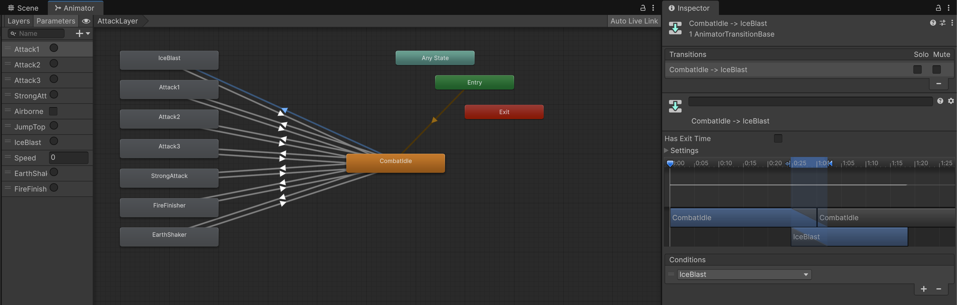 The transition from IDLE COMBAT to any combat move state should not have any exit time so that the transition is immediate. You should add the appropriate trigger parameter as defined in your AttackData