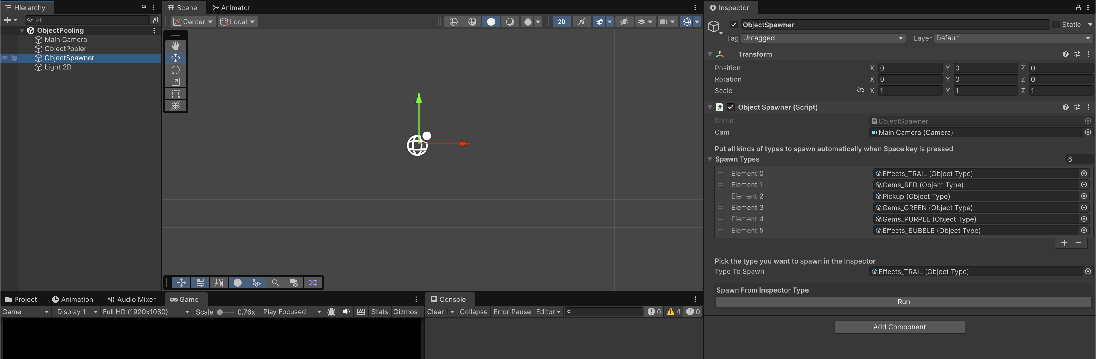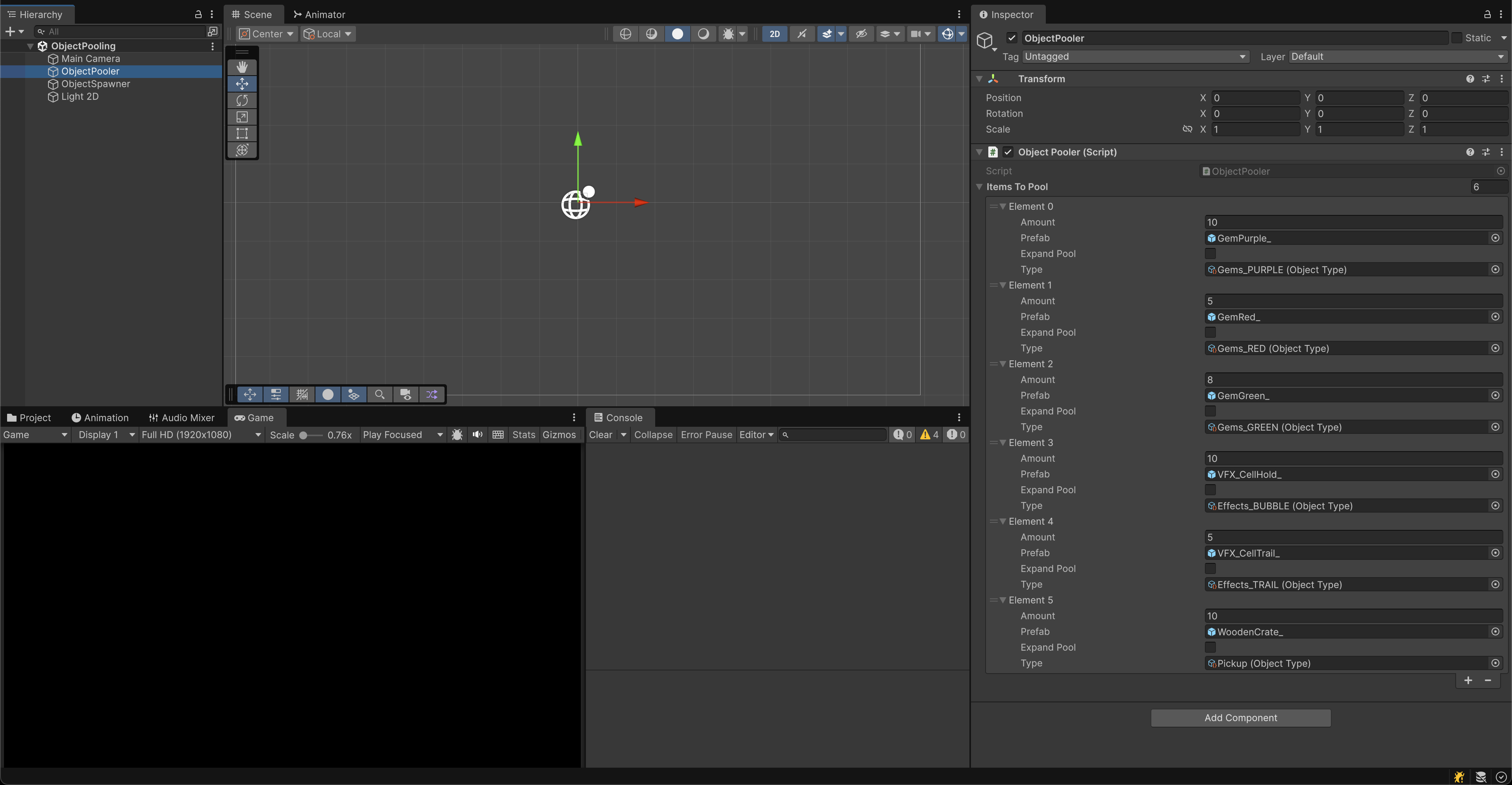script to define the objects to instantiate in the pool. We can conventiently define in the inspector the characteristics of the objects to be spawned.