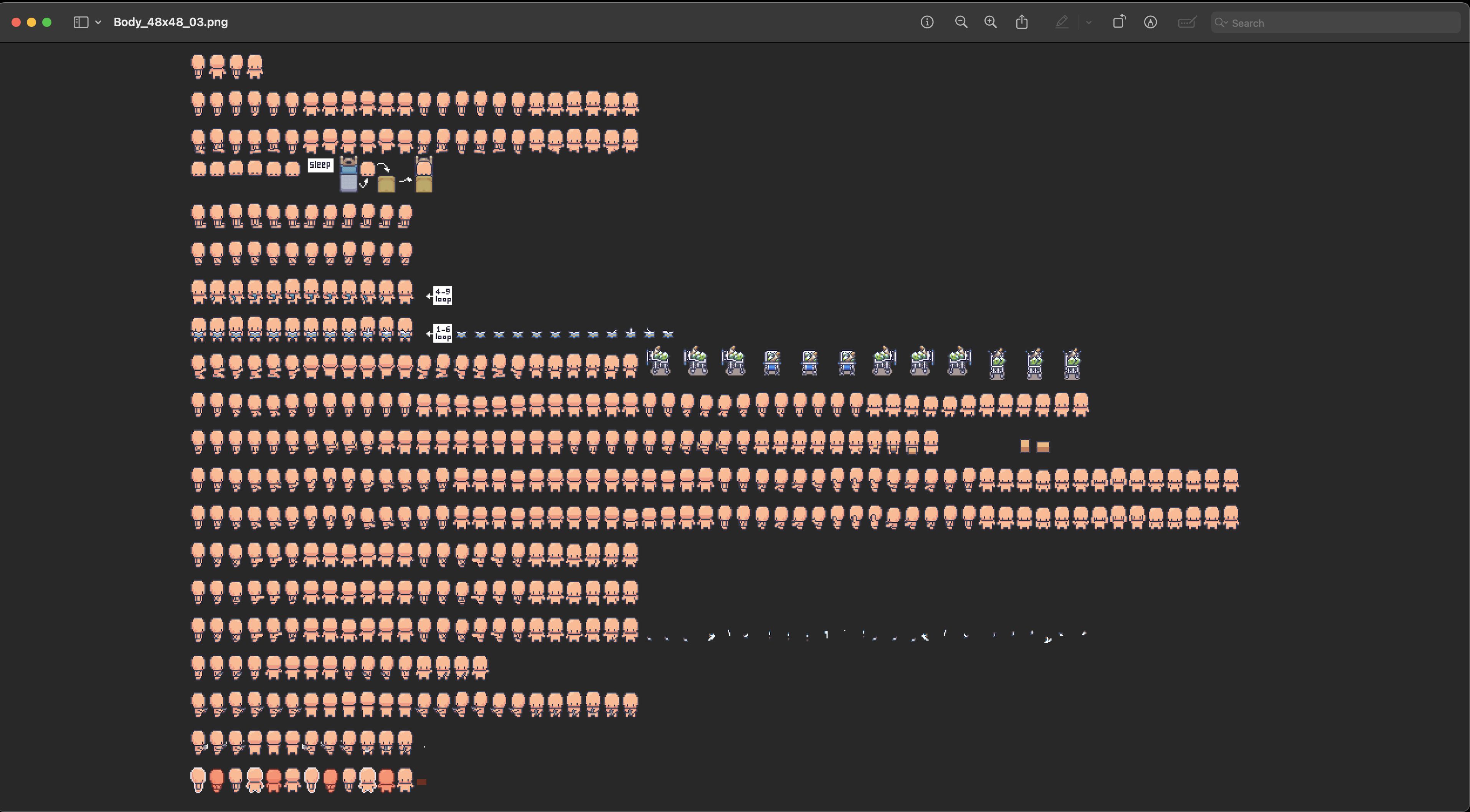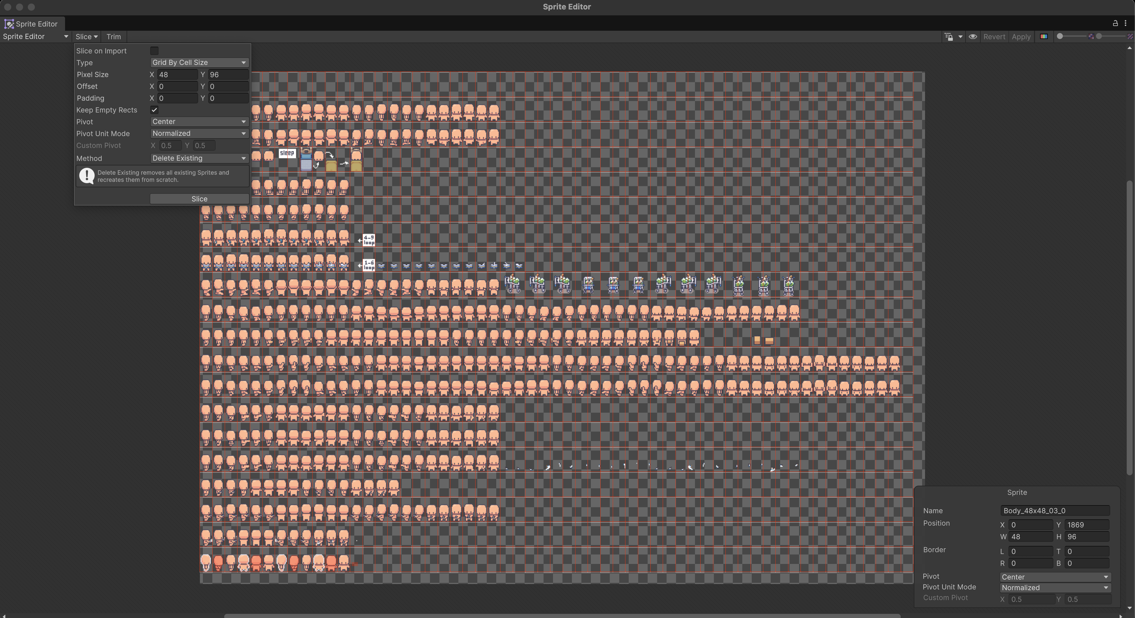 This shows a Body category spritesheet, 48×48 pixel dimension, variant 03, slice 0. This sheet would have its PPU set to 48 as well.