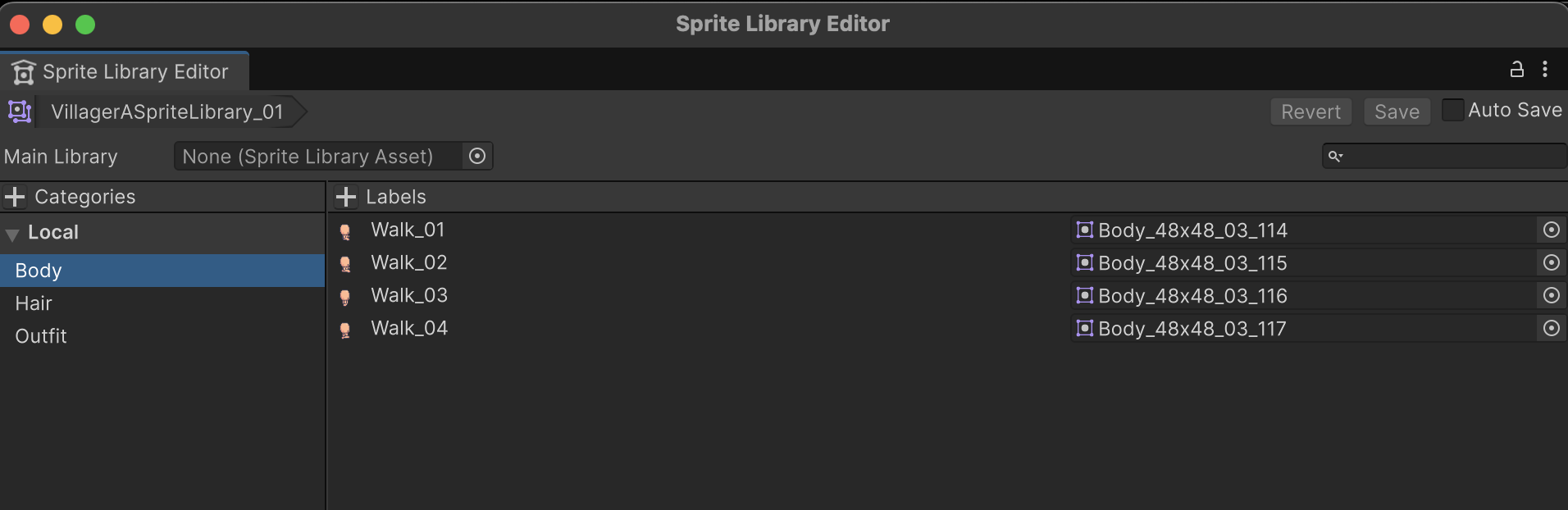 is just a dictionary mapping those labels to actual sprites. - So if VillagerA and VillagerB both have categories/labels defined the same way, you can swap the library, and all the existing Animator clips continue to work but the art changes.